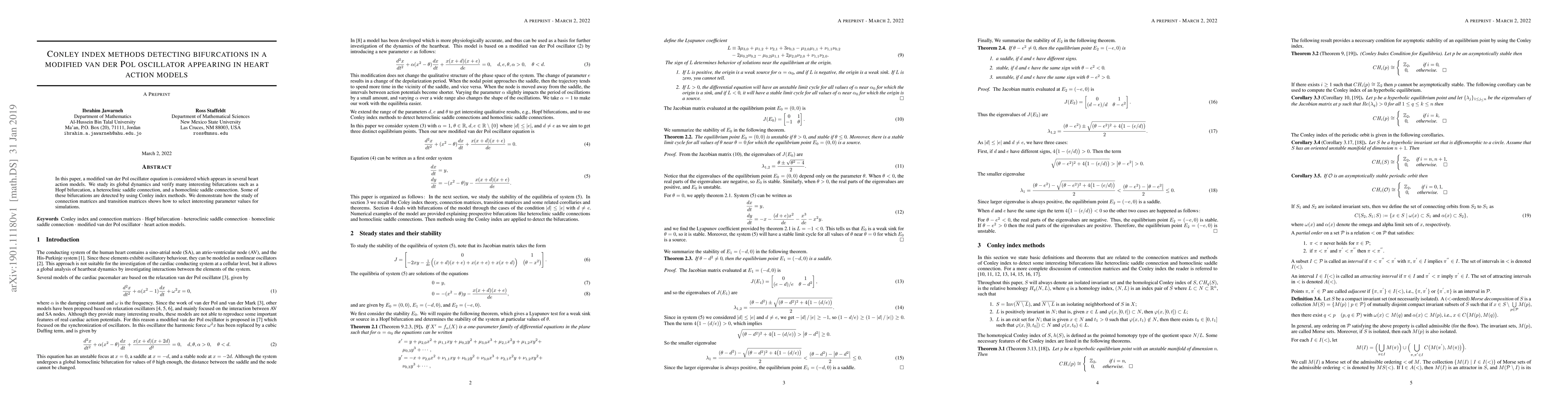 This paper uses a modified van der Pol oscillator in heart action models to study global dynamics and detect bifurcations using Conley index methods. It finds interesting bifurcations like Hopf, heteroclinic saddle connections, and homoclinic saddle connections.