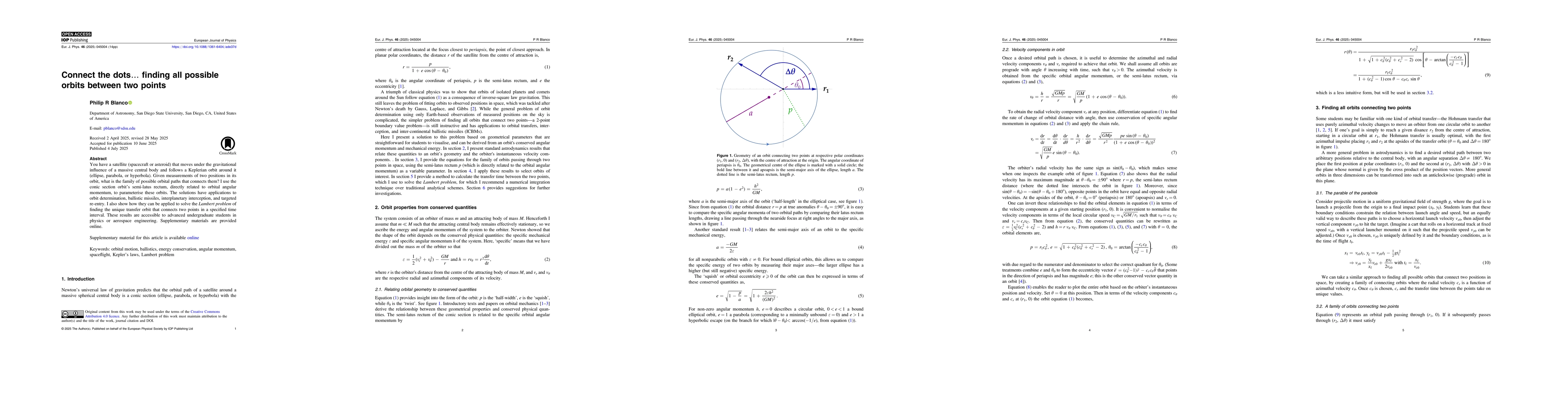 You have a satellite spacecraft or asteroid that moves under the gravitational influence of a massive central body and follows a Keplerian orbit around it ellipse parabola or hyperbola Given measurements of two positions in its orbit what is the family of possible orbital paths that connects them I use the conic section orbits semilatus rectum directly related to orbital angular momentum to parameterise these orbits The solutions have applications to orbit determination ballistic missiles interplanetary interception and targeted reentry I also show how they can be applied to solve the Lambert problem of finding the unique transfer orbit that connects two points in a specified time interval These results are accessible to advanced undergraduate students in physics or aerospace engineering. Supplementary materials are provided online