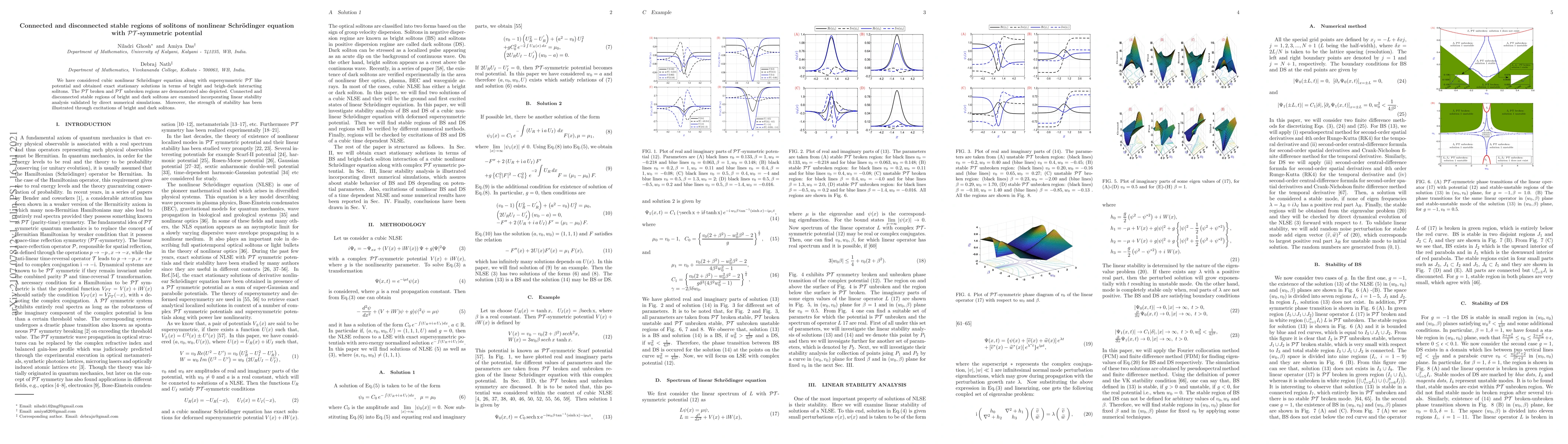 We have considered cubic nonlinear Schr\"odinger equation along with supersymmetric $\mathcal{PT}$ like potential and obtained exact stationary solutions in terms of bright and brigh-dark interacting solitons. The $\mathcal{PT}$ broken and $\mathcal{PT}$ unbroken regions are demonstrated also depicted. Connected and disconnected stable regions of bright and dark solitons are examined incorporating linear stability analysis validated by direct numerical simulations. Moreover, the strength of stability has been illustrated through excitations of bright and dark solitons.