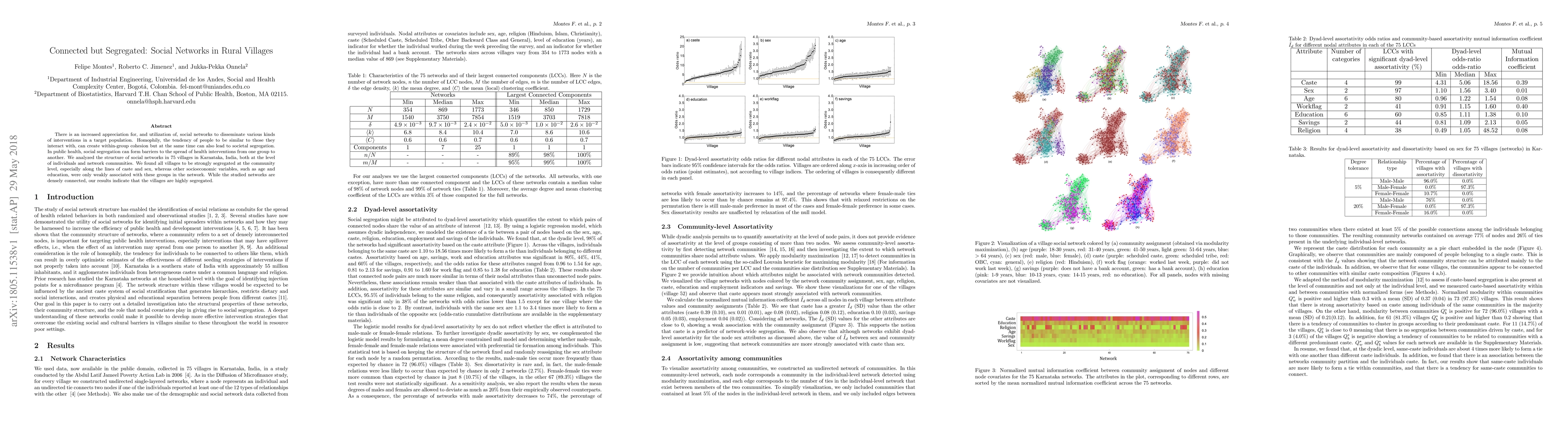 There is an increased appreciation for, and utilization of, social networks to disseminate various kinds of interventions in a target population. Homophily, the tendency of people to be similar to those they interact with, can create within-group cohesion but at the same time can also lead to societal segregation. In public health, social segregation can form barriers to the spread of health interventions from one group to another. We analyzed the structure of social networks in 75 villages in Karnataka, India, both at the level of individuals and network communities. We found all villages to be strongly segregated at the community level, especially along the lines of caste and sex, whereas other socioeconomic variables, such as age and education, were only weakly associated with these groups in the network. While the studied networks are densely connected, our results indicate that the villages are highly segregated.