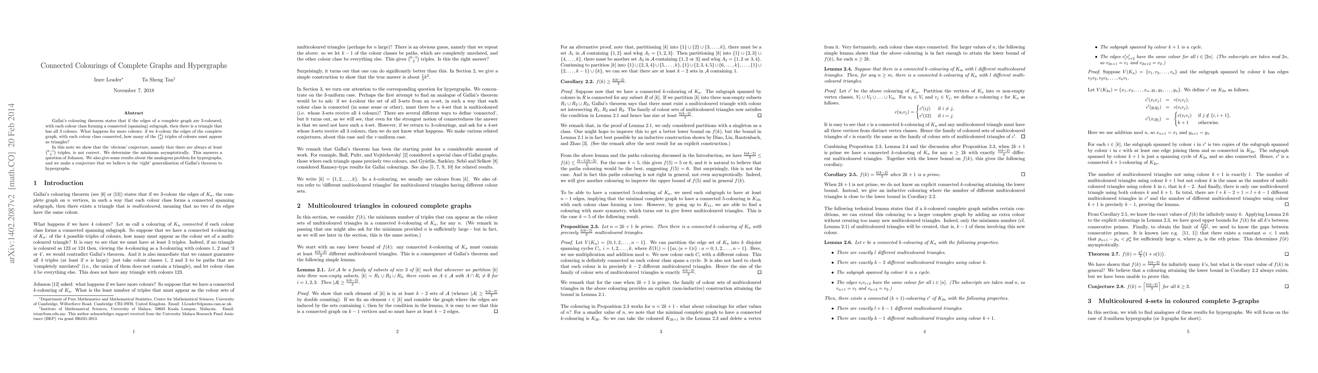 Gallai's colouring theorem states that if the edges of a complete graph are 3-coloured, with each colour class forming a connected (spanning) subgraph, then there is a triangle that has all 3 colours. What happens for more colours: if we $k$-colour the edges of the complete graph, with each colour class connected, how many of the $\binom{k}{3}$ triples of colours must appear as triangles? In this note we show that the `obvious' conjecture, namely that there are always at least $\binom{k-1}{2}$ triples, is not correct. We determine the minimum asymptotically. This answers a question of Johnson. We also give some results about the analogous problem for hypergraphs, and we make a conjecture that we believe is the `right' generalisation of Gallai's theorem to hypergraphs.