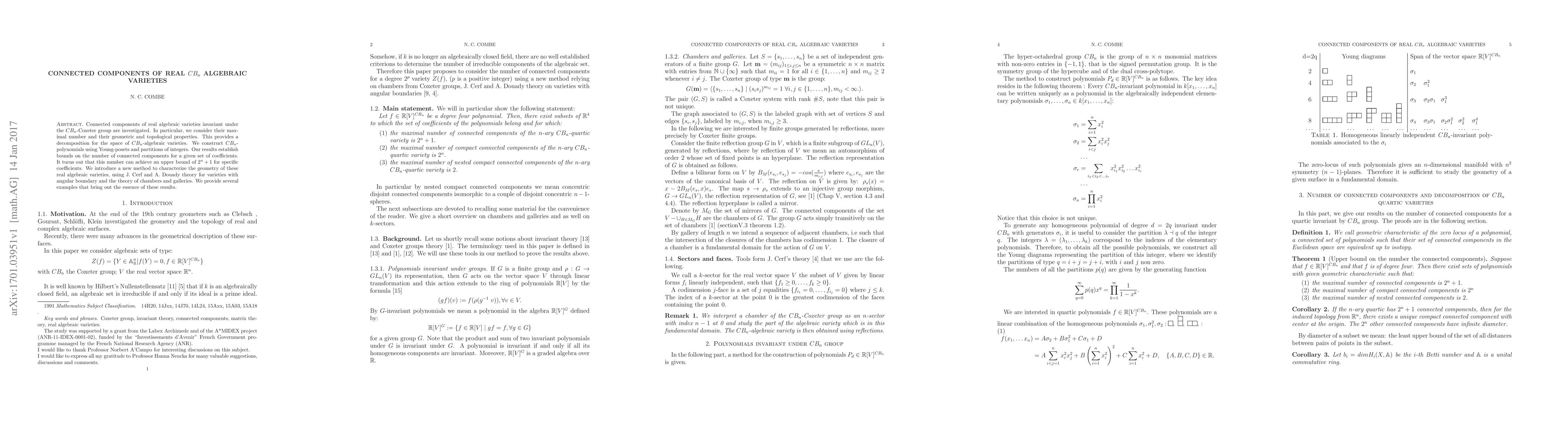 This paper investigates the connected components of real $CB_{n}$ algebraic varieties invariant under the $CB_{n}$-Coxeter group, establishing bounds on their number and exploring their geometric and topological properties. The study introduces a new method to characterize these varieties using J. Cerf and A. Douady theory and the theory of chambers and galleries, revealing an upper bound of $2^{n}+1$ connected components for specific coefficients.