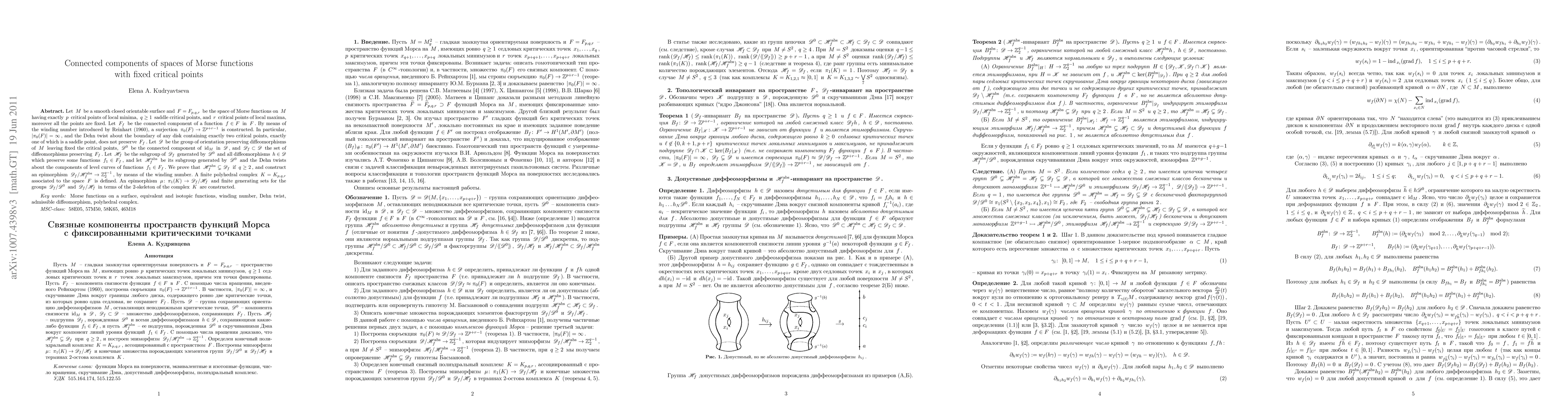 Let $M$ be a smooth closed orientable surface and $F=F_{p,q,r}$ be the space of Morse functions on $M$ having exactly $p$ critical points of local minima, $q\ge1$ saddle critical points, and $r$ critical points of local maxima, moreover all the points are fixed. Let $F_f$ be the connected component of a function $f\in F$ in $F$. By means of the winding number introduced by Reinhart (1960), a surjection $\pi_0(F)\to{\mathbb Z}^{p+r-1}$ is constructed. In particular, $|\pi_0(F)|=\infty$, and the Dehn twist about the boundary of any disk containing exactly two critical points, exactly one of which is a saddle point, does not preserve $F_f$. Let $\mathscr D$ be the group of orientation preserving diffeomorphisms of $M$ leaving fixed the critical points, ${\mathscr D}^0$ be the connected component of ${\rm id}_M$ in $\mathscr D$, and ${\mathscr D}_f\subset{\mathscr D}$ the set of diffeomorphisms preserving $F_f$. Let ${\mathscr H}_f$ be the subgroup of ${\mathscr D}_f$ generated by ${\mathscr D}^0$ and all diffeomorphisms $h\in{\mathscr D}$ which preserve some functions $f_1\in F_f$, and let ${\mathscr H}_f^{\rm abs}$ be its subgroup generated ${\mathscr D}^0$ and the Dehn twists about the components of level curves of functions $f_1\in F_f$. We prove that ${\mathscr H}_f^{\rm abs}\subsetneq{\mathscr D}_f$ if $q\ge2$, and construct an epimorphism ${\mathscr D}_f/{\mathscr H}_f^{\rm abs}\to{\mathbb Z}_2^{q-1}$, by means of the winding number. A finite polyhedral complex $K=K_{p,q,r}$ associated to the space $F$ is defined. An epimorphism $\mu:\pi_1(K)\to{\mathscr D}_f/{\mathscr H}_f$ and finite generating sets for the groups ${\mathscr D}_f/{\mathscr D}^0$ and ${\mathscr D}_f/{\mathscr H}_f$ in terms of the 2-skeleton of the complex $K$ are constructed.