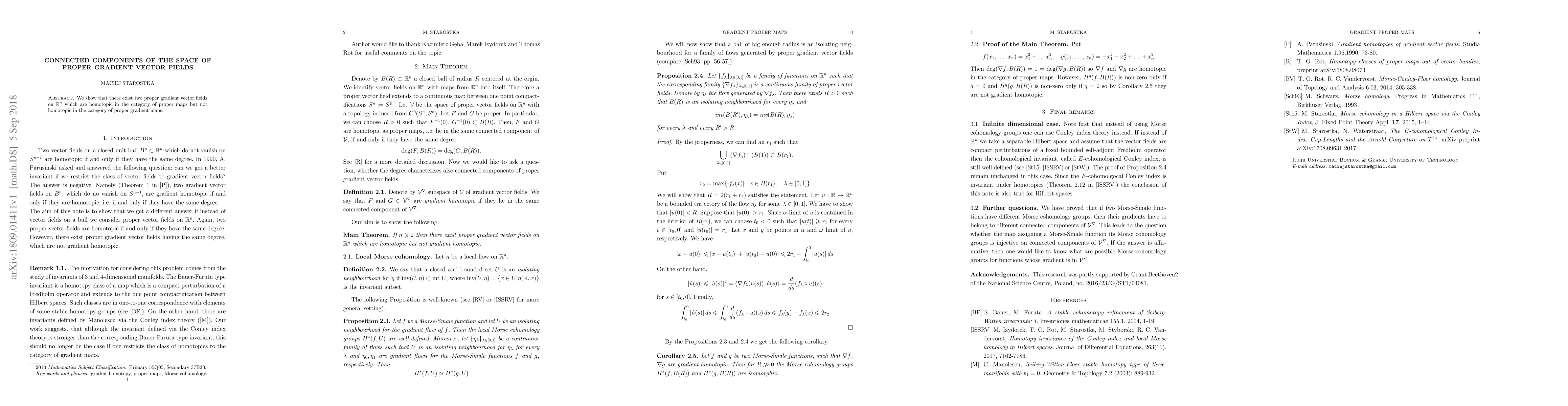 We show that there exist two proper gradient vector fields on $\mathbb{R}^n$ which are homotopic in the category of proper maps but not homotopic in the category of proper gradient maps.