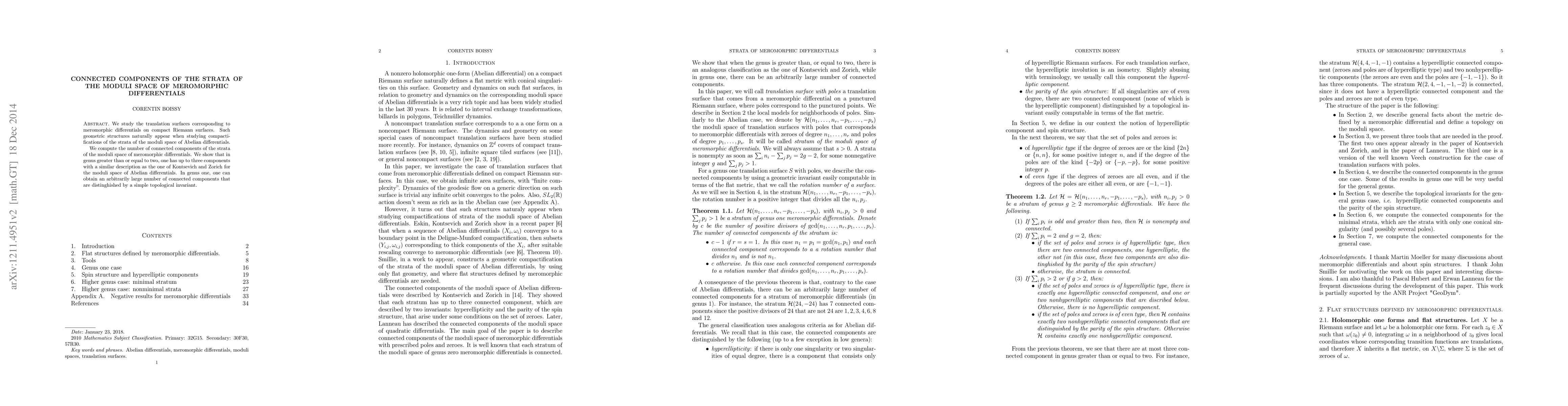 This paper investigates translation surfaces arising from meromorphic differentials on compact Riemann surfaces, determining the connected components of their corresponding strata in the moduli space. For genus ≥2, up to three components are found, similar to the Kontsevich and Zorich description for Abelian differentials; in genus 1, an arbitrarily large number of components can occur, each identifiable by a simple topological invariant.