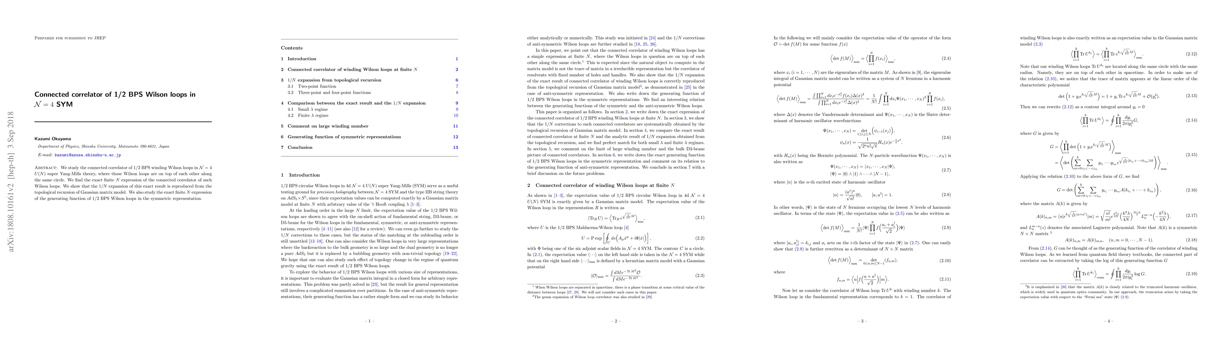 This paper derives the exact finite $N$ expression for the connected correlator of 1/2 BPS winding Wilson loops in $\mathcal{N}=4$ super Yang-Mills theory and demonstrates that its $1/N$ expansion matches the topological recursion of the Gaussian matrix model. It also investigates the generating function of these Wilson loops in the symmetric representation.