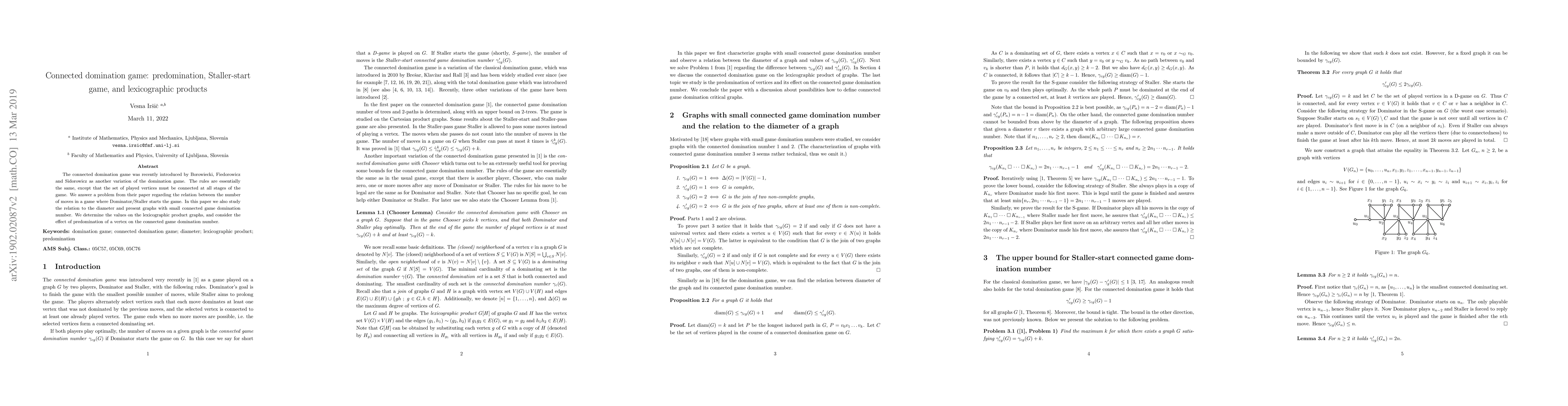 The research analyzes the connected domination game, focusing on predomination, Staller-start game, and lexicographic products, providing theoretical results and constructing graphs with specific properties.