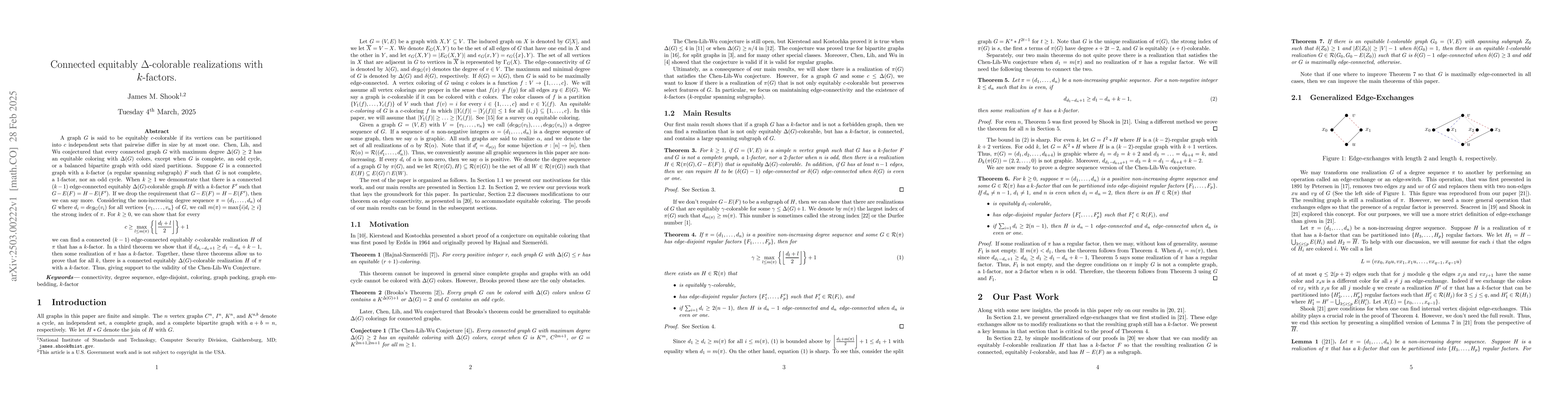 The paper presents novel methods for constructing connected equitably colorable graphs with k-factors, leveraging degree sequences and strong indices, and proves key theorems supporting the Chen-Lih-Wu Conjecture.