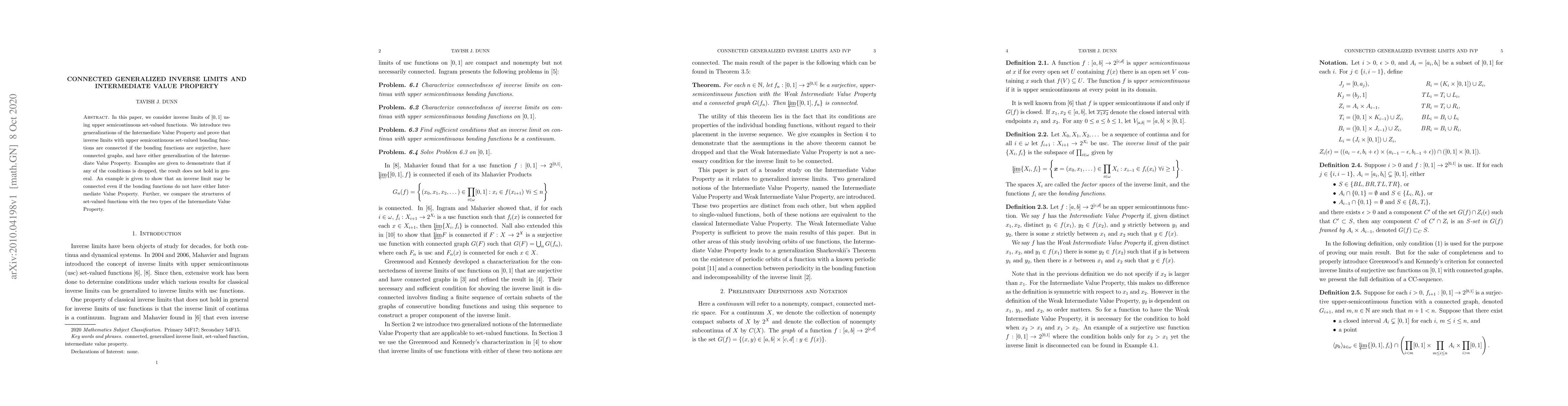 This paper explores inverse limits of $[0,1]$ through upper semicontinuous set-valued functions, proving that such limits are connected if the bonding functions are surjective, have connected graphs, and possess certain generalized Intermediate Value Properties. It also provides counterexamples showing that dropping any condition generally fails to maintain connectivity.