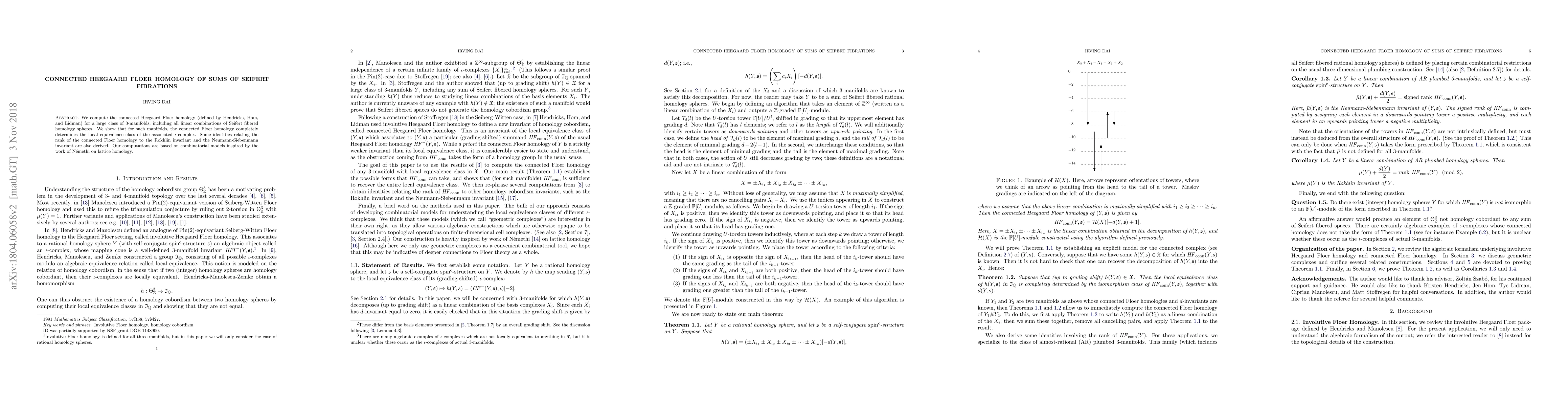 This paper computes connected Heegaard Floer homology for sums of Seifert fibrations, demonstrating its ability to determine local equivalence classes of $\iota$-complexes and deriving identities linking the rank to invariants like the Rokhlin and Neumann-Siebenmann invariants. The methodology is grounded in combinatorial models derived from N\'emethi's lattice homology work.