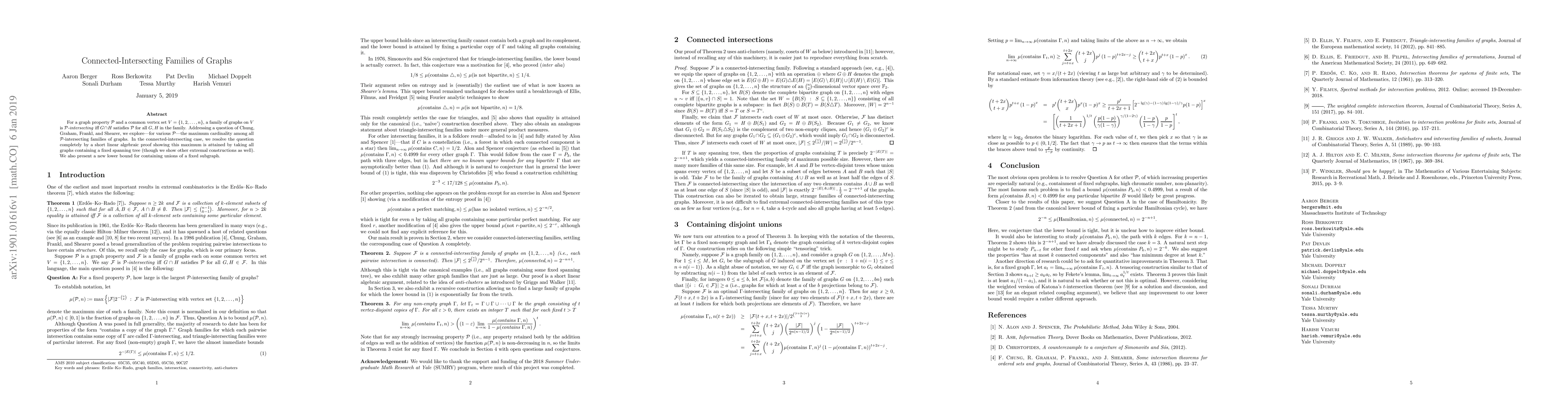Summary: This paper investigates the maximum size of connected-intersecting families of graphs, proving that the largest such family consists of all graphs containing a specific spanning tree. Additionally, it establishes a new lower bound for families containing unions of a fixed subgraph.