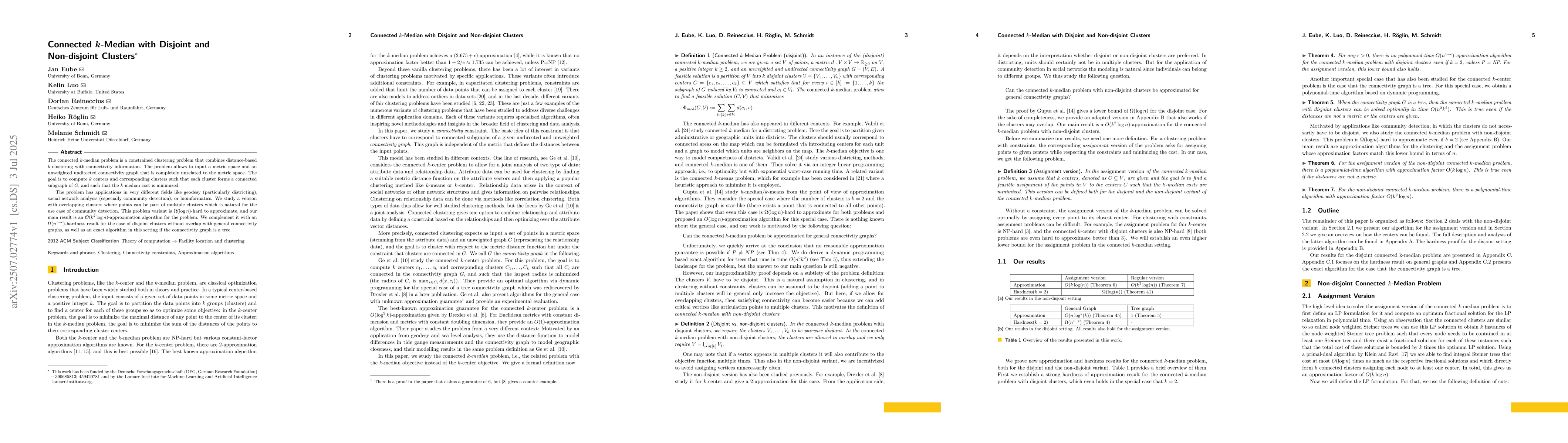 The paper introduces an efficient approximation algorithm for a constrained clustering problem that combines distance-based clustering with connectivity constraints, along with hardness results for specific cases.