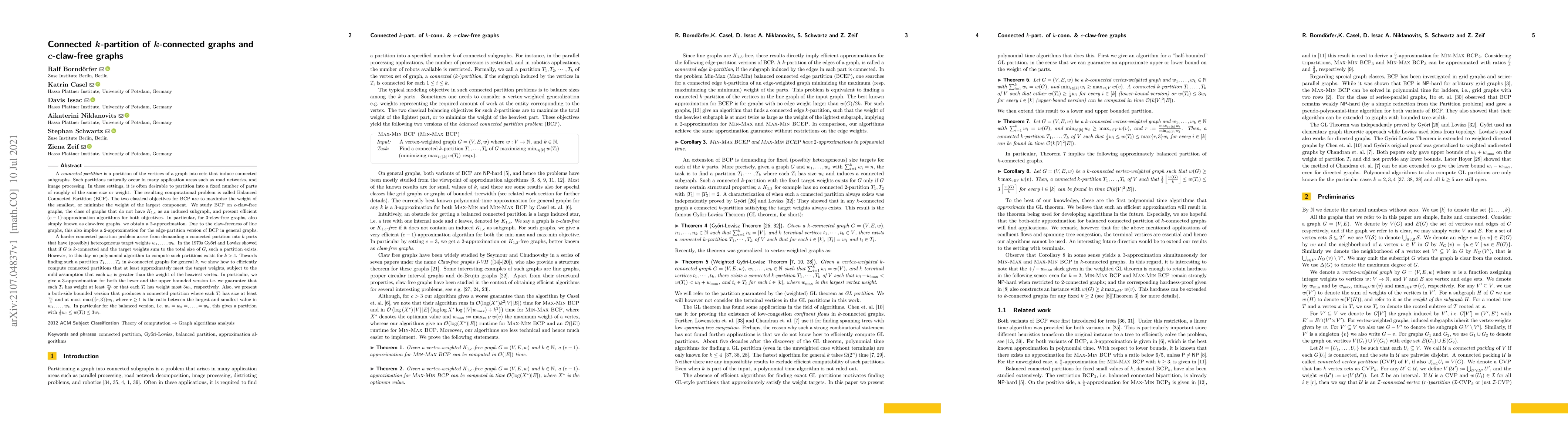 The paper presents novel approximation algorithms for connected k-partitions in k-connected and c-claw-free graphs, with a (c-1)-approximation for the specified objectives.
