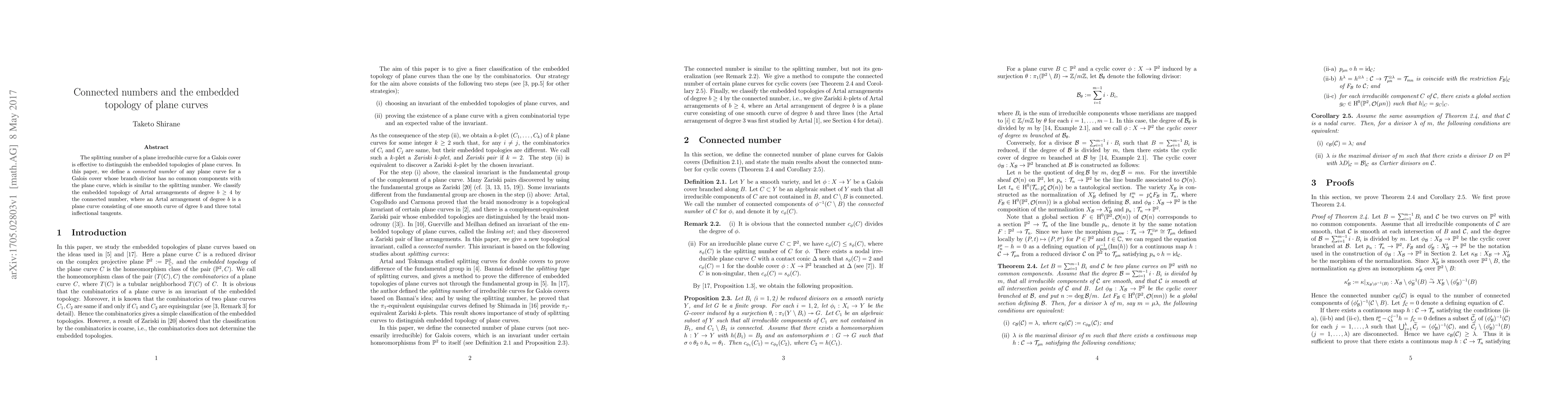 Researchers classify plane curves with certain topological properties based on their connected numbers, which help distinguish embedded topologies. They also study Artal arrangements of degree $b eq 4$ and find connections between the connected number and the curve's topology.
