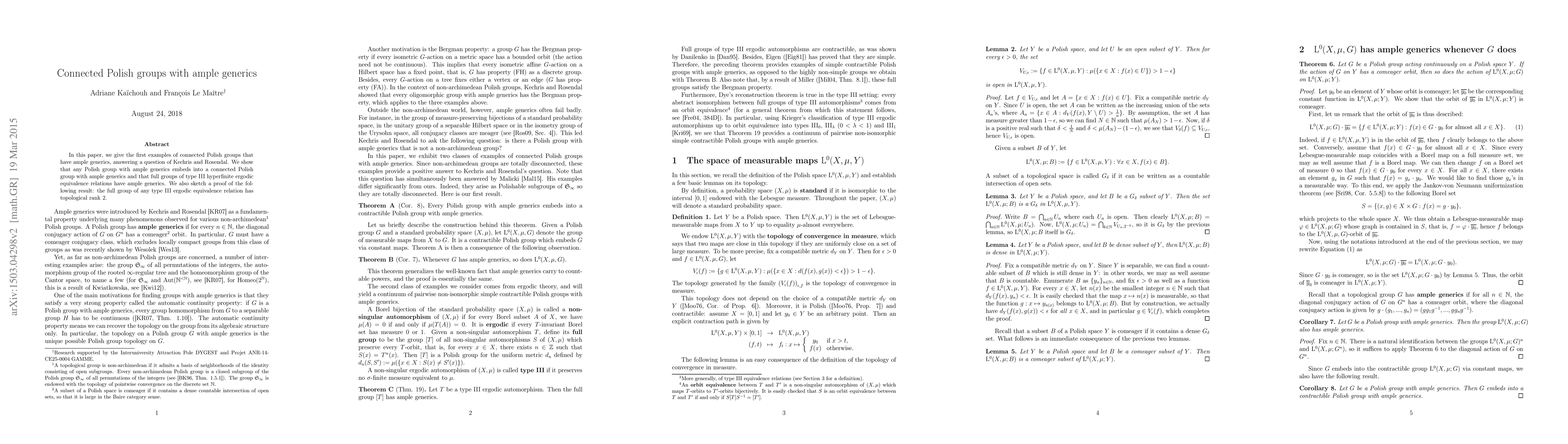 This paper presents the first examples of connected Polish groups with ample generics, addressing a question posed by Kechris and Rosendal. It demonstrates that any Polish group with ample generics can be embedded into such a connected group and highlights that full groups of type III hyperfinite ergodic equivalence relations possess ample generics, along with a sketch proving their topological rank is 2.