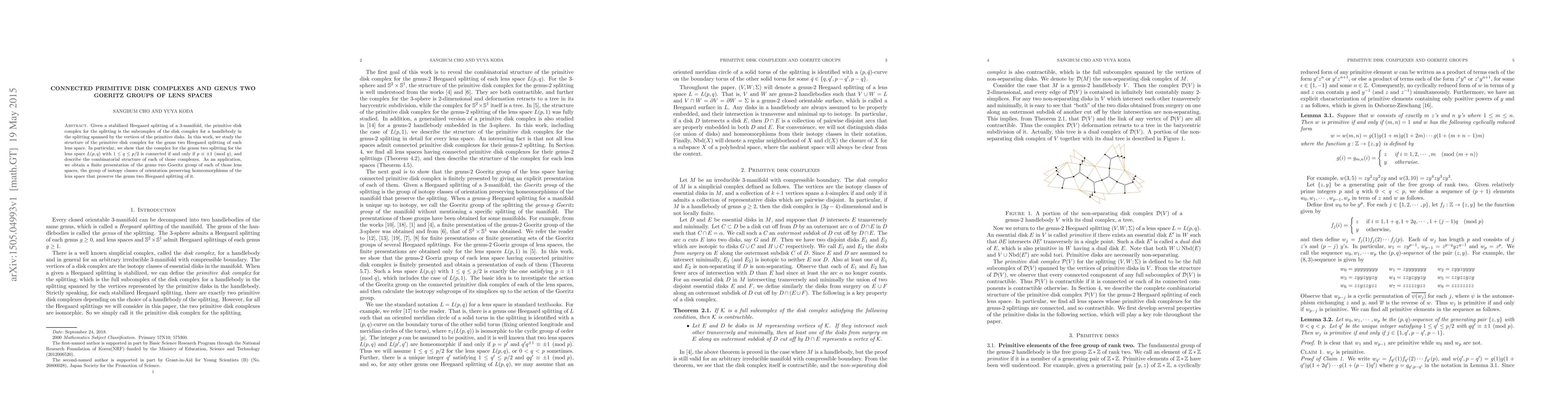 The paper introduces a detailed analysis of connectedness conditions for primitive disk complexes and provides a method to derive finite presentations for Goeritz groups of lens spaces, advancing the theoretical framework for understanding these complex structures.