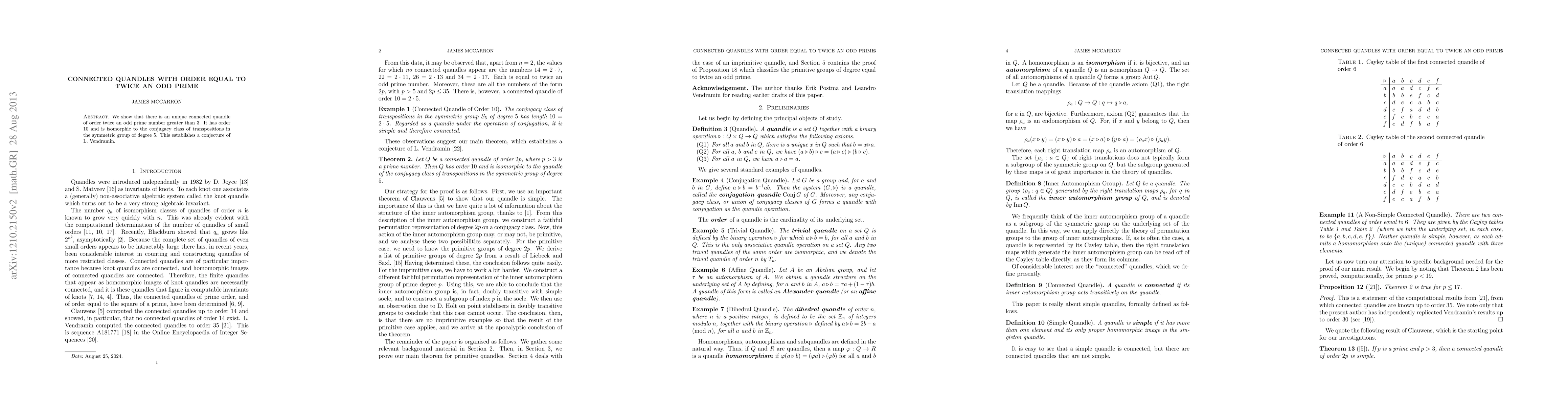 Title: Connected Quandles with Order Equal to Twice an Odd Prime Summary: The paper demonstrates the existence of a unique connected quandle of order 10, confirming a conjecture and establishing it as isomorphic to the transpositions in the symmetric group of degree 5.