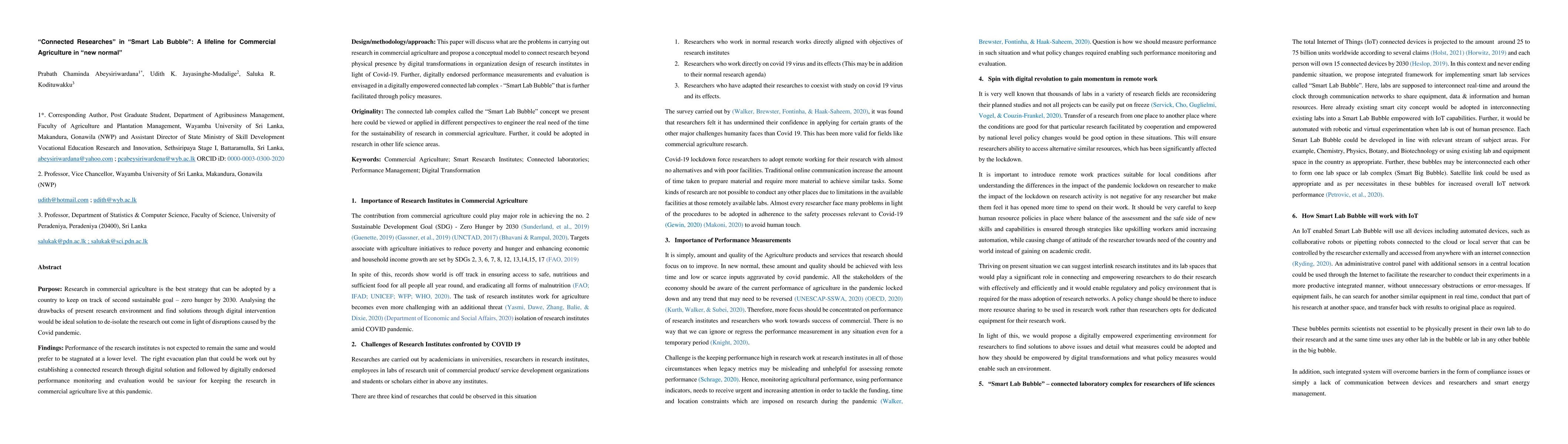 Research in commercial agriculture is the best strategy that can be adopted by a country to keep on track of the second sustainable goal -- zero hunger by 2030. Analyzing the drawbacks of present research environment and find solutions through digital intervention would be ideal solution to de-isolate the research out come in light of disruptions caused by the Covid pandemic. The performance of the research institutes is not expected to remain the same and would prefer to be stagnated at a lower level. The right evacuation plan that could be worked out by establishing connected research through the digital solution and followed by digitally endorsed performance monitoring and evaluation would be saviour for keeping the research in commercial agriculture live at this pandemic. This paper will discuss what are the problems in carrying out research in commercial agriculture and propose a conceptual model to connect research beyond physical presence by digital transformations in organization design of research institutes in light of Covid-19. Further, digitally endorsed performance measurements and evaluation is envisaged in a digitally empowered connected lab complex -- "Smart Lab Bubble" that is further facilitated through policy measures. The connected lab complex called the "Smart Lab Bubble" concept we present here could be viewed or applied in different perspectives to engineer the real need of the time for the sustainability of research in commercial agriculture. Further, it could be adopted in research in other life science areas.