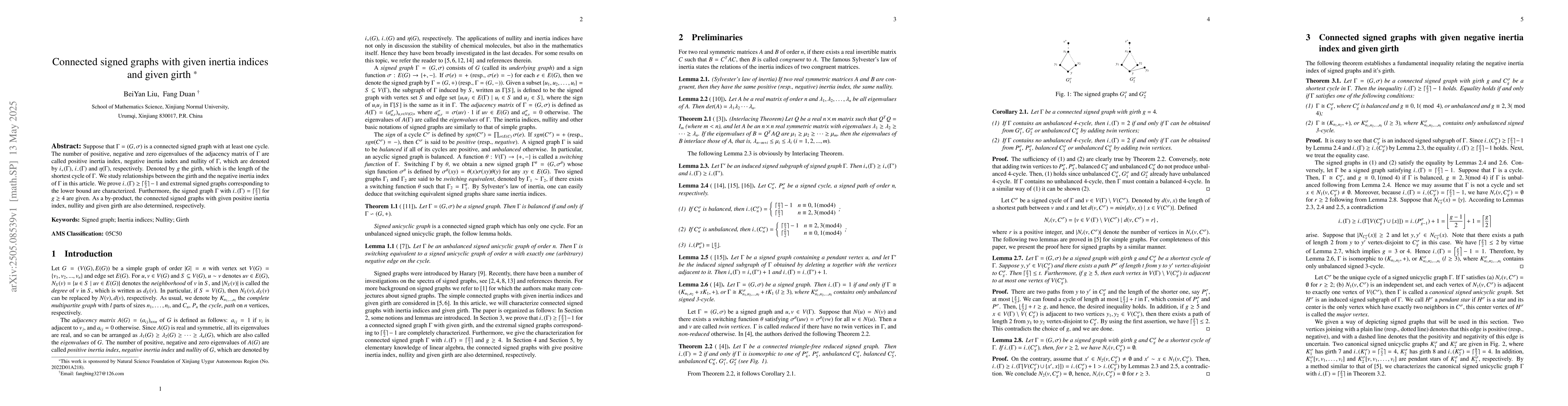 The paper employs graph theory and spectral analysis, focusing on connected signed graphs and their inertia indices in relation to girth.