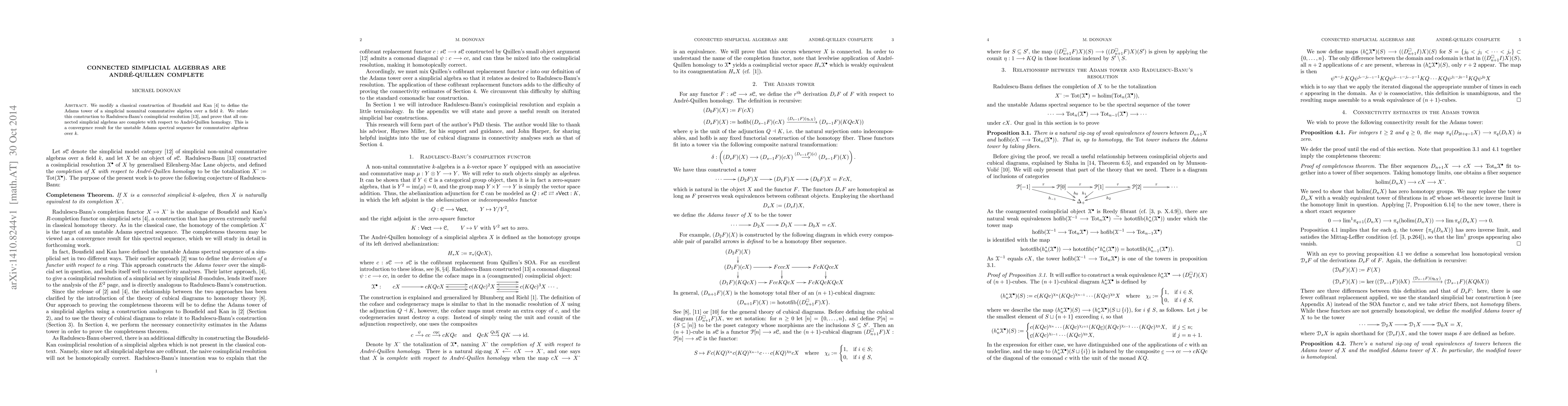 This paper establishes a modified Adams tower for simplicial nonunital commutative algebras over a field, connecting it to Radulescu-Banu's cosimplical resolution, and demonstrates the Andr\'e-Quillen completeness of all connected simplicial algebras. This result supports the convergence of the unstable Adams spectral sequence for commutative algebras.