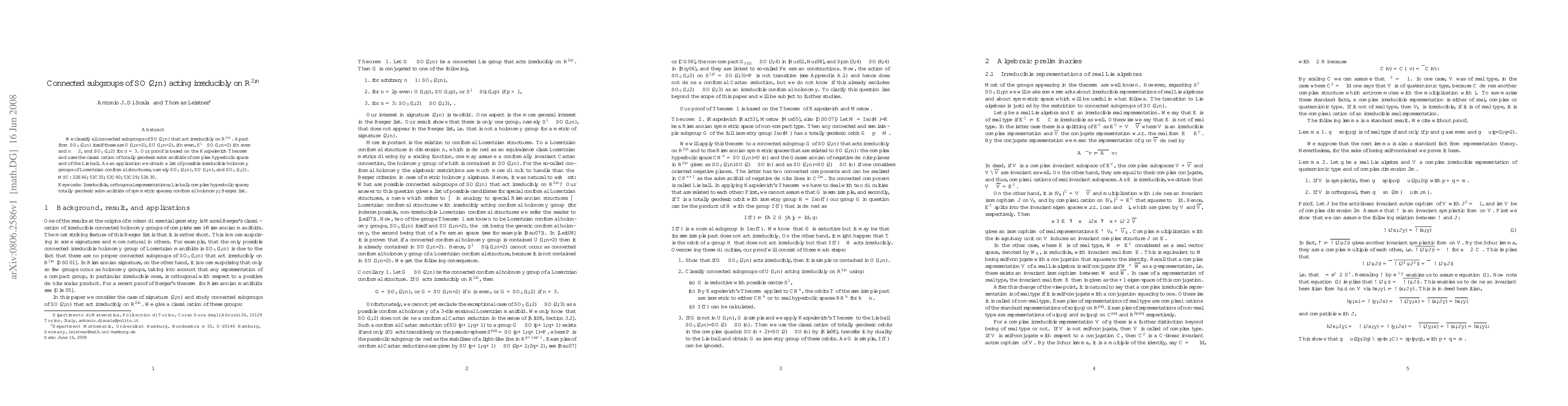 This paper classifies connected subgroups of SO(2,n) acting irreducibly on $\R^{2,n}$, identifying $U(1,n/2)$, $SU(1,n/2)$, $S^1\cdot SO(1,n/2)$ (for even $n$), and $SO_0(1,2)$ (for $n=3$) alongside $SO_0(2,n)$. The proof leverages the Karpelevich Theorem and the classification of submanifolds in complex hyperbolic space.