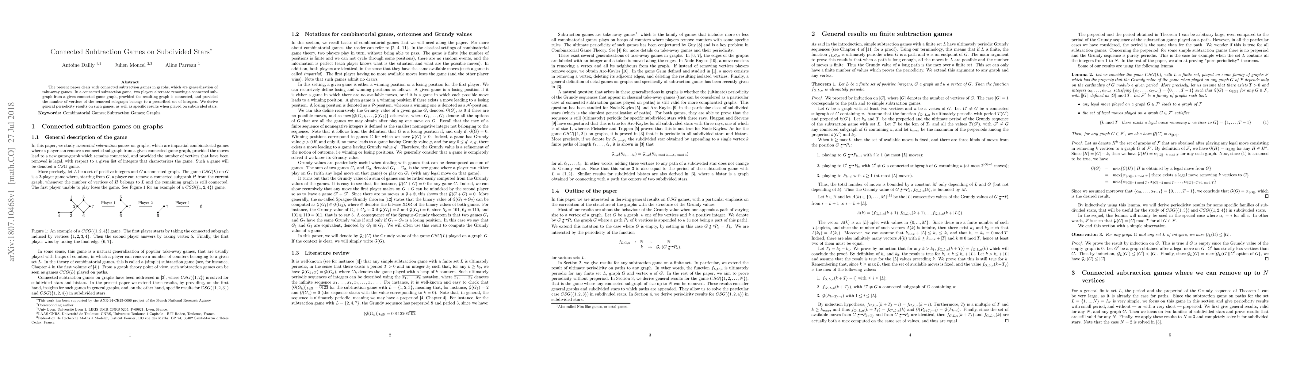 This paper investigates connected subtraction games in graphs, focusing on the rules where players remove connected subgraphs while maintaining graph connectivity, with vertex counts from a specific set. It derives general periodicity results and examines particular outcomes for games played on subdivided star graphs.
