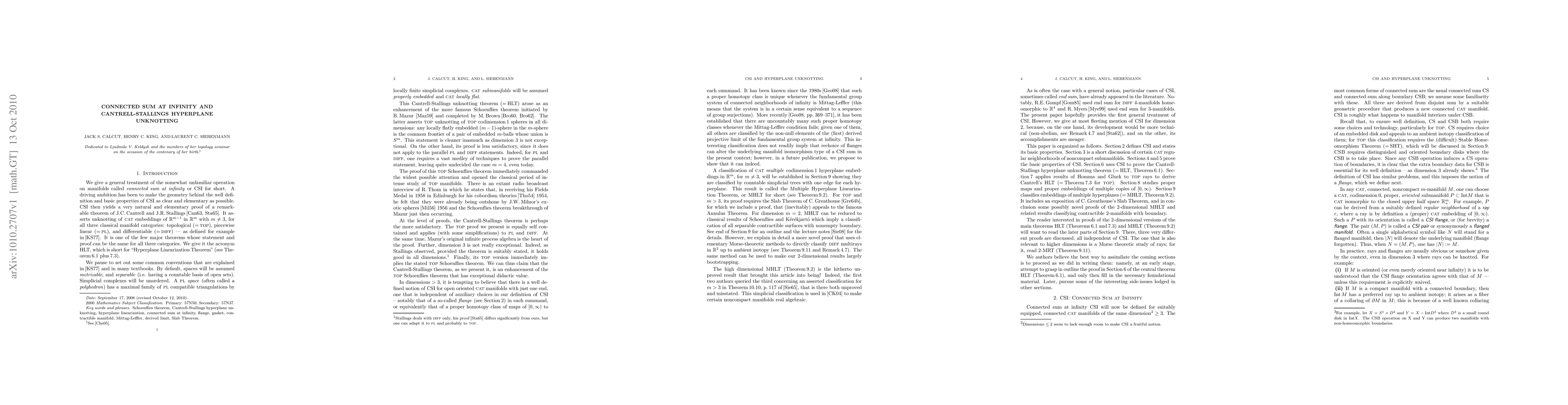 We give a general treatment of the somewhat unfamiliar operation on manifolds called Connected Sum at Infinity, or CSI for short. A driving ambition has been to make the geometry behind the well definition and basic properties of CSI as clear and elementary as possible. CSI then yields a very natural and elementary proof of a remarkable theorem of J. C. Cantrell and J. R. Stallings. It asserts unknotting of proper embeddings of euclidean (m-1)-space in euclidean m-space with m not equal to 3, for all three classical manifold categories: topological, piecewise linear, and differentiable. It is one of the few major theorems whose statement and proof can be the same for all three categories. We give it the acronym HLT, which is short for Hyperplane Linearization Theorem. The topological version of the HLT immediately implies B. Mazur's topological Schoenflies theorem. We can thus claim that the Cantrell-Stallings theorem, as we present it, is an enhancement of the topological Schoenflies theorem that has exceptional didactic value. We also prove a classification of multiple codimension 1 hyperplane embeddings in eucldiean m-space for m not equal to 3. Namely, they are classified by countable simplicial trees with one edge for each hyperplane (planar trees for m=2). This result is called the Multiple Hyperplane Linearization Theorem, or MHLT for short. We give an exposition of C. Greathouse's Slab Theorem, and in conclusion some possibly novel proofs of the 2-dimensional MHLT and related results classifying contractible 2-manifolds with boundary.