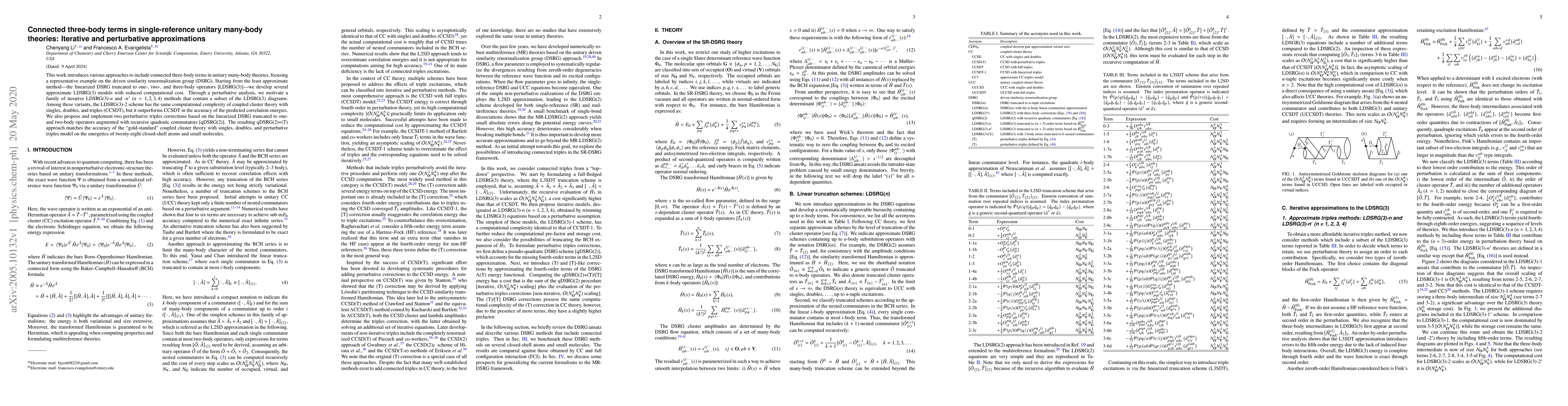 This paper explores methods to incorporate connected three-body terms in unitary many-body theories, specifically focusing on the driven similarity renormalization group (DSRG). It introduces iterative and perturbative approximations, including the LDSRG(3)-2 scheme, which matches the accuracy of CCSDT but with lower computational cost.