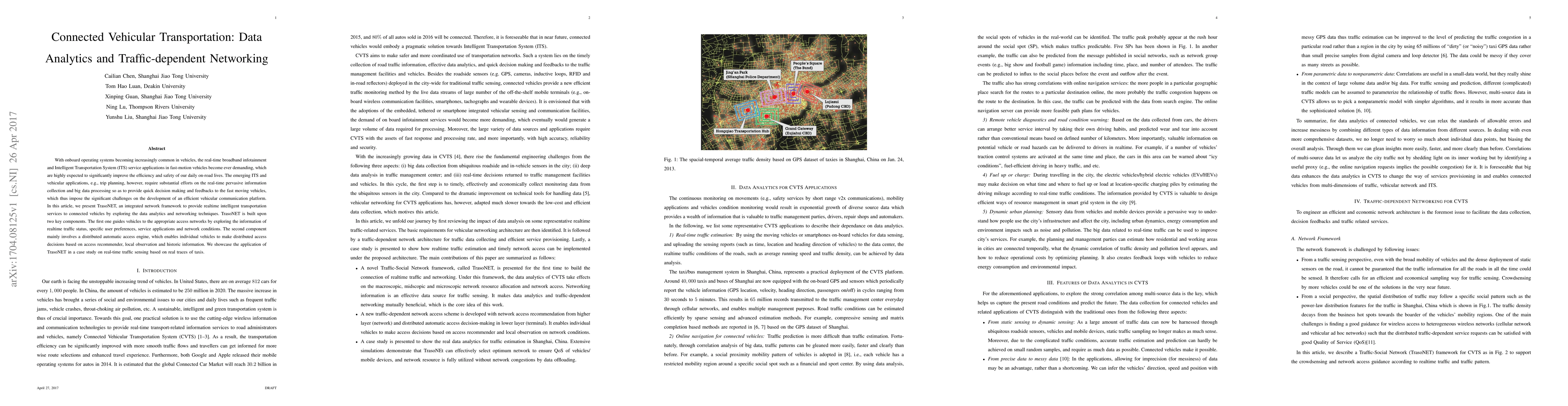 This paper introduces TrasoNET, a framework for real-time intelligent transportation services for connected vehicles, leveraging data analytics and networking. It employs two components: one guiding vehicles to suitable networks based on traffic and user data, and another enabling distributed access decisions through an automatic access engine. A case study on real-time traffic sensing using taxi data demonstrates its application.