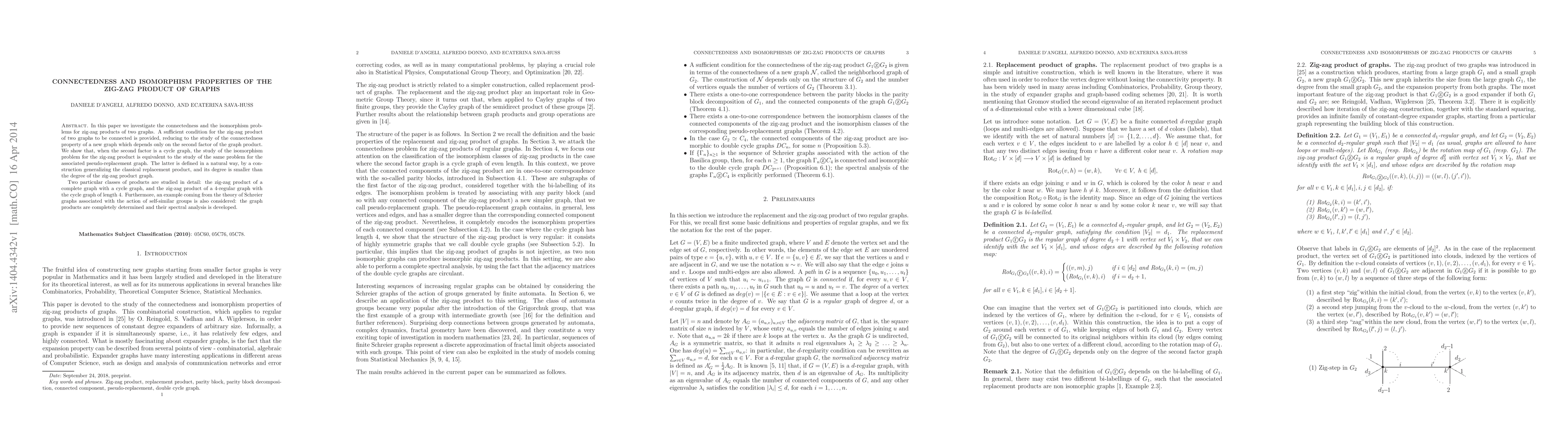 In this paper we investigate the connectedness and the isomorphism problems for zig-zag products of two graphs. A sufficient condition for the zig-zag product of two graphs to be connected is provided, reducing to the study of the connectedness property of a new graph which depends only on the second factor of the graph product. We show that, when the second factor is a cycle graph, the study of the isomorphism problem for the zig-zag product is equivalent to the study of the same problem for the associated pseudo-replacement graph. The latter is defined in a natural way, by a construction generalizing the classical replacement product, and its degree is smaller than the degree of the zig-zag product graph. Two particular classes of products are studied in detail: the zig-zag product of a complete graph with a cycle graph, and the zig-zag product of a $4$-regular graph with the cycle graph of length $4$. Furthermore, an example coming from the theory of Schreier graphs associated with the action of self-similar groups is also considered: the graph products are completely determined and their spectral analysis is developed.