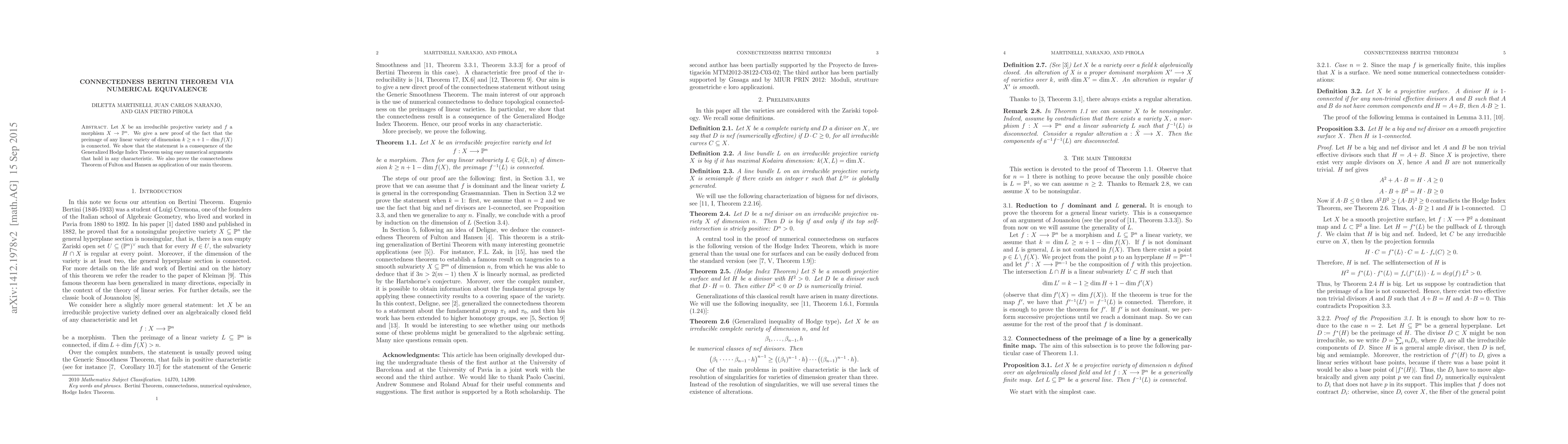 This paper provides a new proof of the connectedness Bertini Theorem using the Generalized Hodge Index Theorem and numerical arguments, demonstrating that the preimage of a sufficiently high-dimensional linear variety under a projective morphism is connected. It also applies this method to prove the connectedness Theorem of Fulton and Hansen.