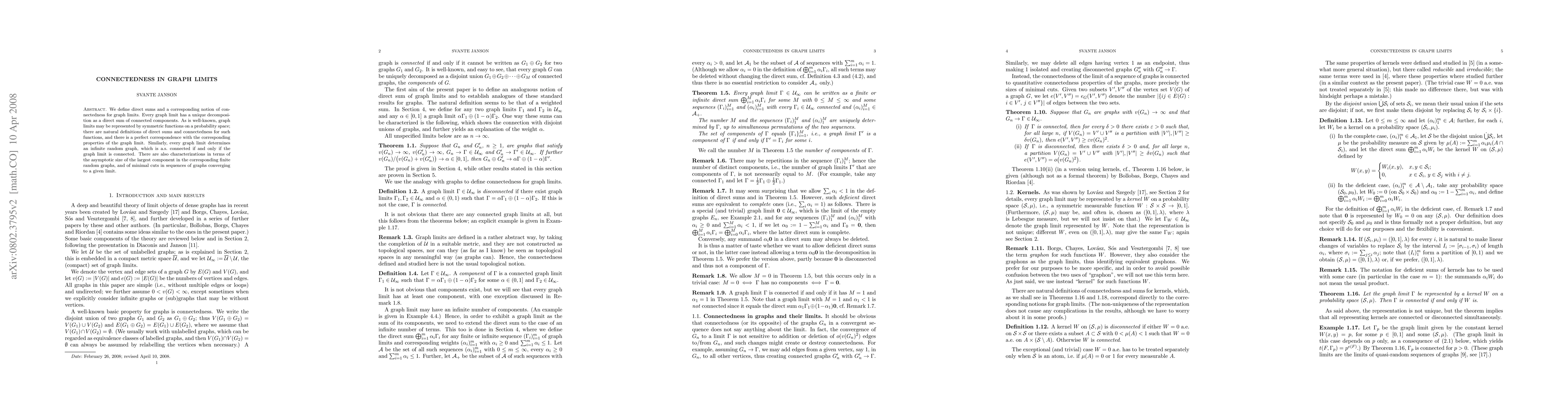 This paper introduces direct sums and connectedness in the context of graph limits, demonstrating that every graph limit uniquely decomposes into connected components. It establishes a correspondence between these properties in graph limits and their representations as symmetric functions on a probability space, as well as their connection to infinite random graphs.