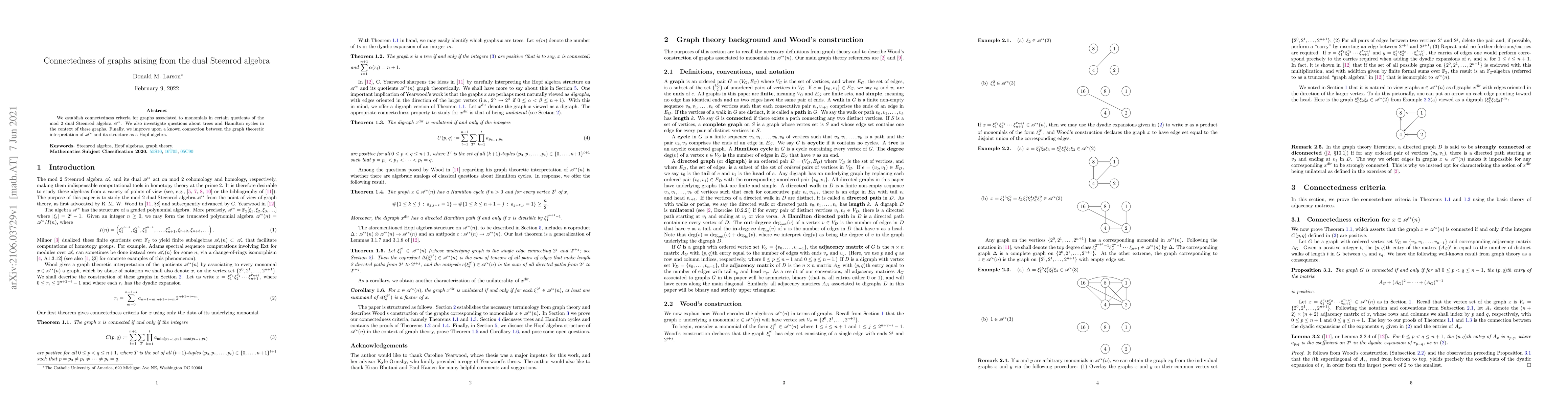 We establish connectedness criteria for graphs associated to monomials in certain quotients of the mod 2 dual Steenrod algebra. We also investigate questions about trees and Hamilton cycles in the context of these graphs. Finally, we improve upon a known connection between the graph theoretic interpretation of the mod 2 dual Steenrod algebra and its structure as a Hopf algebra.