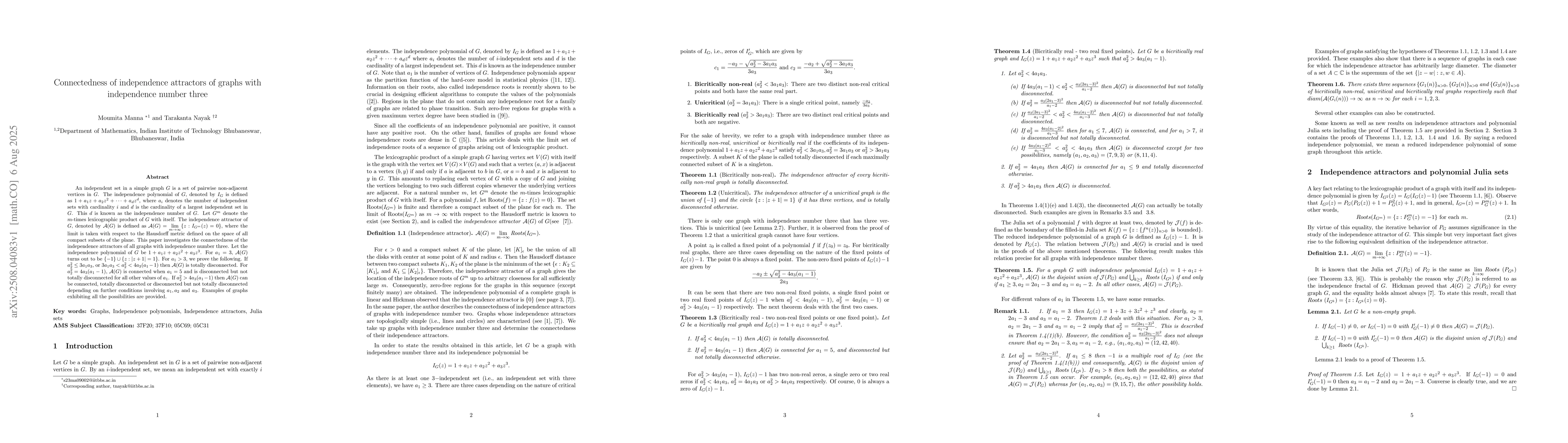 An independent set in a simple graph $G$ is a set of pairwise non-adjacent vertices in $G$. The independence polynomial of $G$, denoted by $I_G$ is defined as $1 + a_1 z + a_2 z^2+\cdots+a_d z^{d}$, where $a_i$ denotes the number of independent sets with cardinality $i$ and $d$ is the cardinality of a largest independent set in $G$. This $d$ is known as the independence number of $G$. Let $G^m$ denote the $m$-times lexicographic product of $G$ with itself. The independence attractor of $G$, denoted by $\mathcal{A}(G)$ is defined as $\mathcal{A}(G) = \lim\limits_{m\rightarrow \infty} \{z: I_{G^m}(z)=0\}$, where the limit is taken with respect to the Hausdorff metric defined on the space of all compact subsets of the plane. This paper investigates the connectedness of the independence attractors of all graphs with independence number three. Let the independence polynomial of $G$ be $1+a_1 z +a_2 z^2 +a_3 z^3$. For $a_1 =3$, $\mathcal{A}(G)$ turns out to be $ \{-1\} \cup \{z: |z+1|=1\} $. For $a_1 >3$, we prove the following. If $a_2 ^2 \leq 3 a_1 a_3$, or $3 a_1 a_3 < a_2 ^2 < 4a_3 (a_1 -1)$ then $\mathcal{A}(G)$ is totally disconnected. For $a_2 ^2 =4a_3 (a_1 -1) $, $\mathcal{A}(G)$ is connected when $a_1 =5$ and is disconnected but not totally disconnected for all other values of $a_1$. If $a_2 ^2 > 4a_3 (a_1 -1)$ then $\mathcal{A}(G)$ can be connected, totally disconnected or disconnected but not totally disconnected depending on further conditions involving $a_1, a_2$ and $a_3$. Examples of graphs exhibiting all the possibilities are provided.