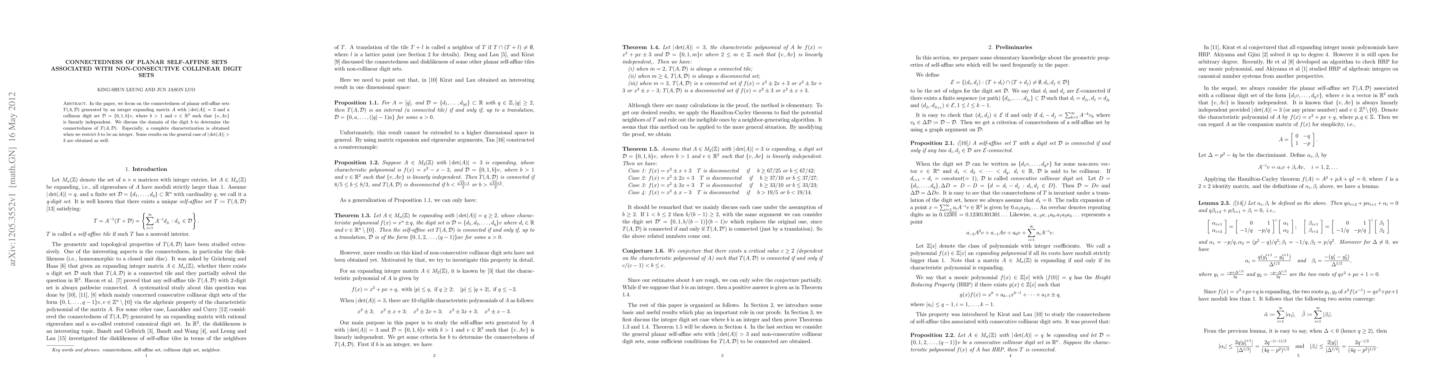 This paper investigates the connectedness of planar self-affine sets $T(A,{\mathcal{D}})$ generated by a matrix $A$ with $|\det(A)|=3$ and a collinear digit set ${\mathcal{D}}=\{0,1,b\}v$. It provides a complete characterization of connectedness when $b$ is an integer, and explores results for cases where $|\det(A)|> 3$.