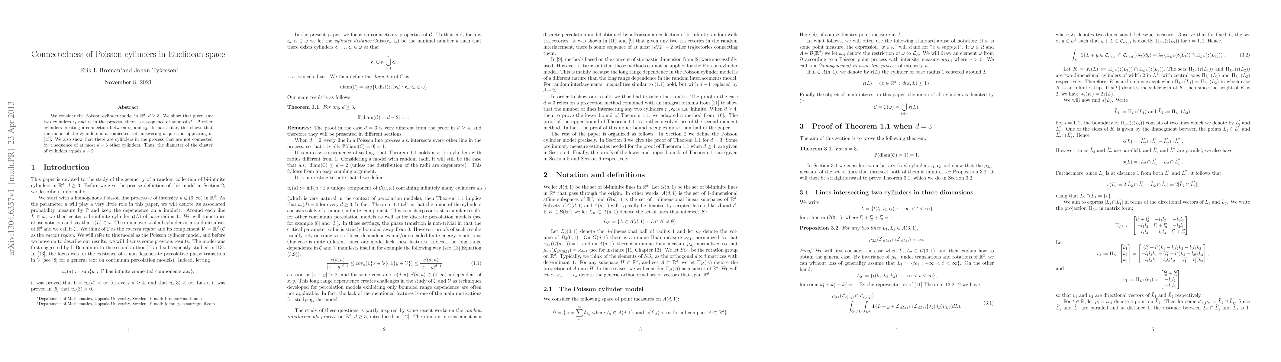 This paper demonstrates that in the Poisson cylinder model in ${\mathbb R}^d$ ($d\ge 3$), any two cylinders can be connected by a sequence of at most $d-2$ other cylinders, proving the union of the cylinders is connected. It also shows that some cylinders cannot be connected by fewer than $d-2$ cylinders, establishing the diameter of the cluster as $d-2$.