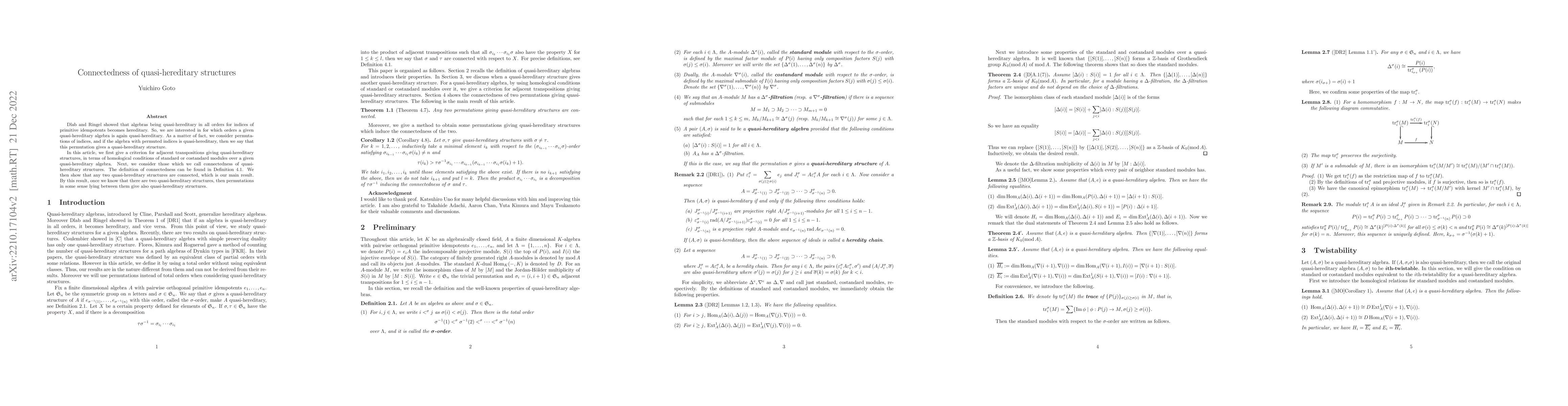 Dlab and Ringel showed that algebras being quasi-hereditary in all orders for indices of primitive idempotents becomes hereditary. So, we are interested in for which orders a given quasi-hereditary algebra is again quasi-hereditary. As a matter of fact, we consider permutations of indices, and if the algebra with permuted indices is quasi-hereditary, then we say that this permutation gives a quasi-hereditary structure. In this article, we first give a criterion for adjacent transpositions giving quasi-hereditary structures, in terms of homological conditions of standard or costandard modules over a given quasi-hereditary algebra. Next, we consider those which we call connectedness of quasihereditary structures. The definition of connectedness can be found in Definition 4.1. We then show that any two quasi-hereditary structures are connected, which is our main result. By this result, once we know that there are two quasi-hereditary structures, then permutations in some sense lying between them give also quasi-hereditary structures.