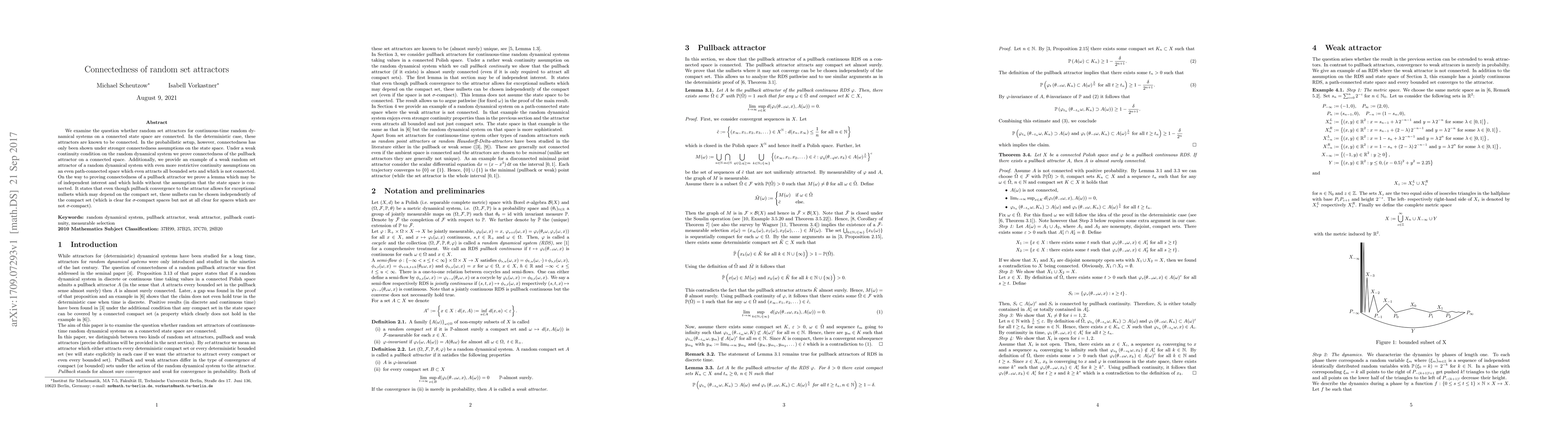This paper proves that random set attractors for continuous-time random dynamical systems on a connected state space are connected under weak continuity conditions. It also provides a counterexample showing that even stronger continuity assumptions may not guarantee connectedness.