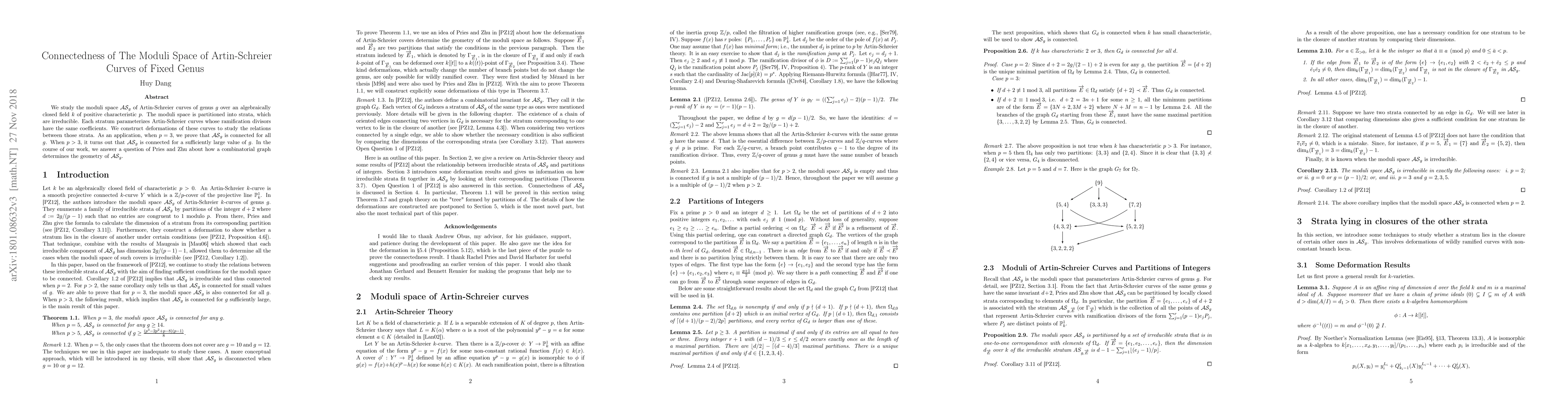 We study the moduli space $\mathcal{AS}_{g}$ of Artin-Schreier curves of genus $g$ over an algebraically closed field $k$ of positive characteristic $p$. The moduli space is partitioned by irreducible strata, where each stratum parameterizes Artin-Schreier curves whose ramification divisors have the same coefficients. We construct deformations of these curves to study the relations between those strata. As an application, when $p=3$, we prove that $\mathcal{AS}_{g}$ is connected for all possible $g$. When $p>3$, it turns out that $\mathcal{AS}_{g}$ is connected for sufficiently large value of $g$. In the course of our work, we answer Pries and Zhu's question about how a combinatorial graph determines the geometry of $\mathcal{AS}_g$.