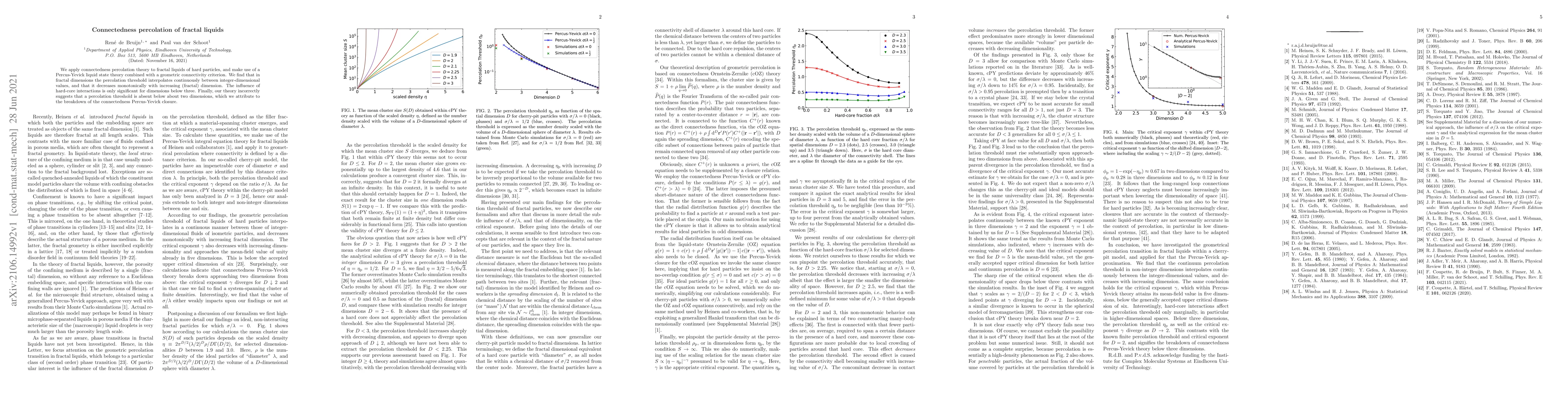 This paper applies connectedness percolation theory to fractal liquids, revealing that the percolation threshold continuously interpolates between integer-dimensional values and decreases with increasing fractal dimension. The study finds hard-core interactions significant only in dimensions below three, and notes a theoretical breakdown below two dimensions.
