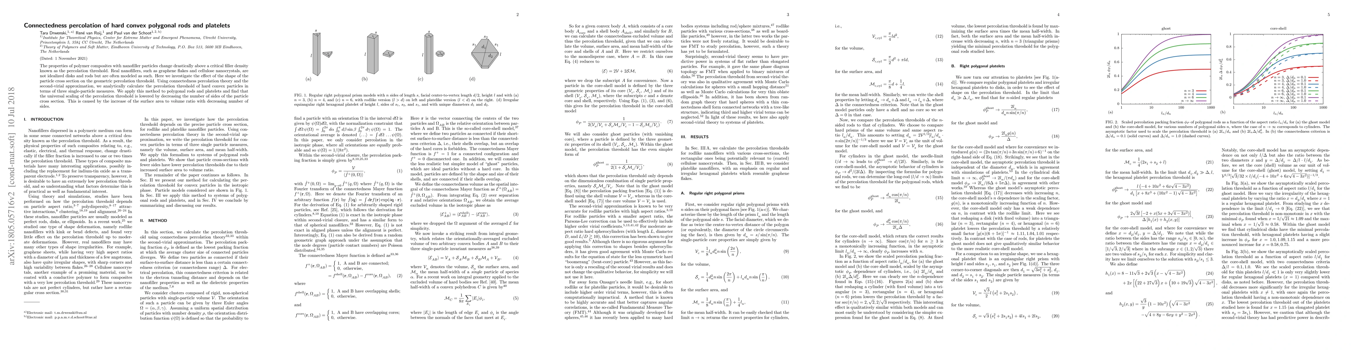 This paper investigates the geometric percolation threshold for hard convex polygonal rods and platelets in polymer composites, finding that the threshold decreases with fewer sides due to increased surface area-to-volume ratio. Analytical methods reveal the impact of particle shape on percolation properties.