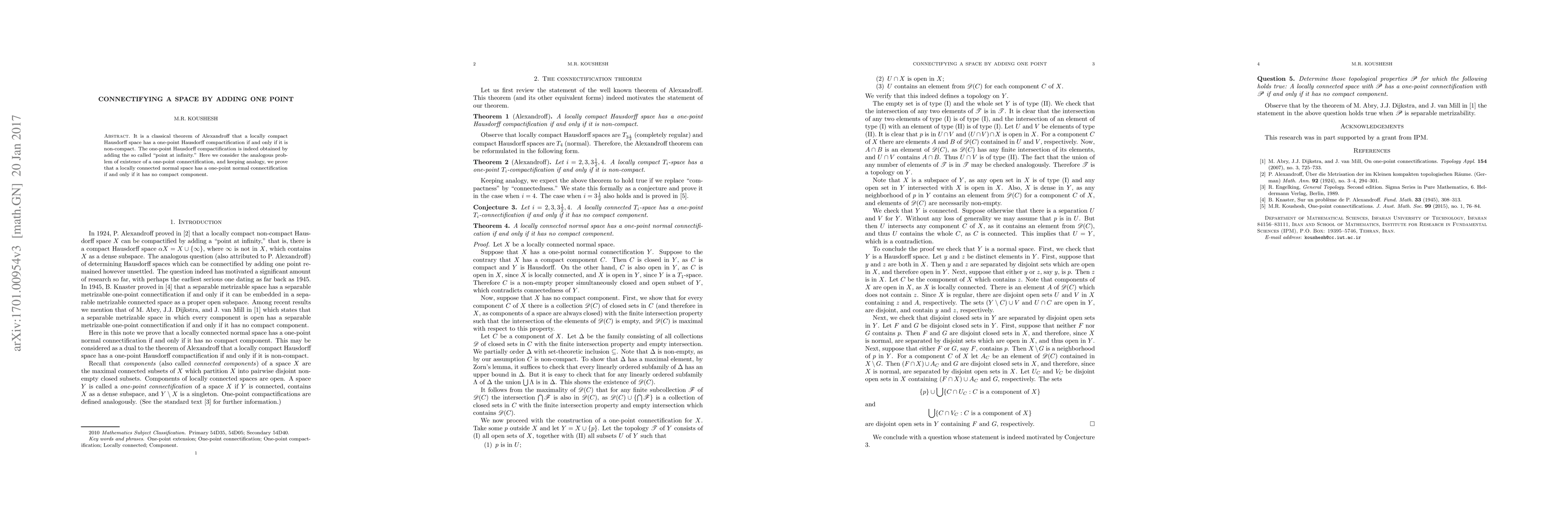 Summary: This paper proves that a locally connected normal space has a one-point normal connectification if and only if it lacks any compact components, extending Alexandroff's theorem on one-point Hausdorff compactifications to the context of connectifications.