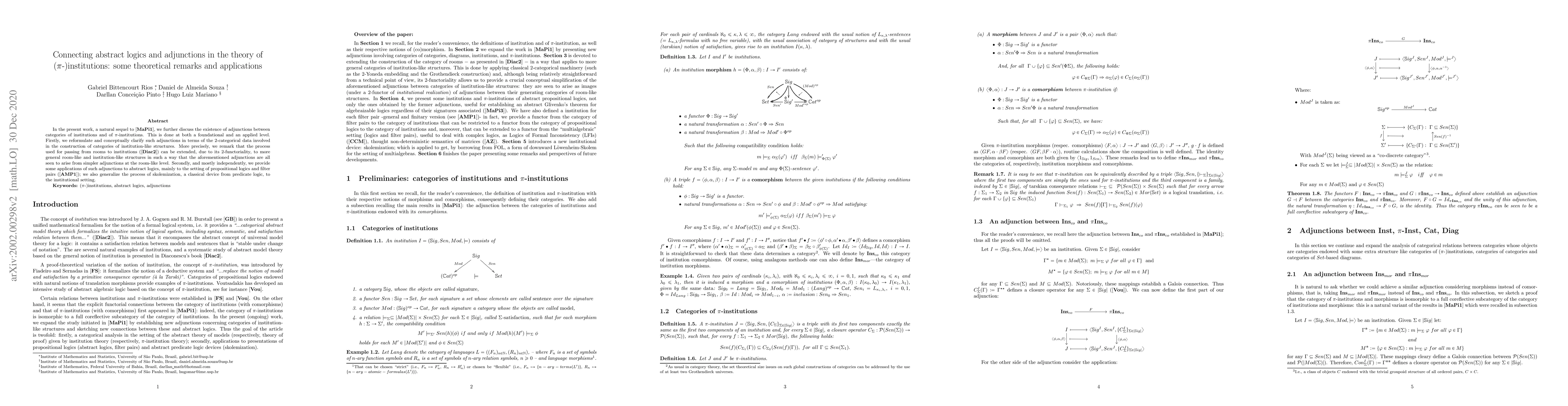 In the present work, a natural sequel to \cite{MaPi1}, we further discuss the existence of adjunctions between categories of institutions and of $\pi$-institutions. This is done at both a foundational and an applied level. Firstly, we reformulate and conceptually clarify such adjunctions in terms of the $2$-categorical data involved in the construction of categories of institution-like structures. More precisely, we remark that the process used for passing from rooms to institutions (\cite{Diac2}) can be extended, due to its $2$-functoriality, to more general room-like and institution-like structures in such a way that the aforementioned adjunctions are all seen to arise from simpler adjunctions at the room-like level. Secondly, and mostly independently, we provide some applications of such adjunctions to abstract logics, mainly to the setting of propositional logics and filter pairs (\cite{AMP1}); we also generalize the process of skolemization, a classical device from predicate logic, to the institutional setting.