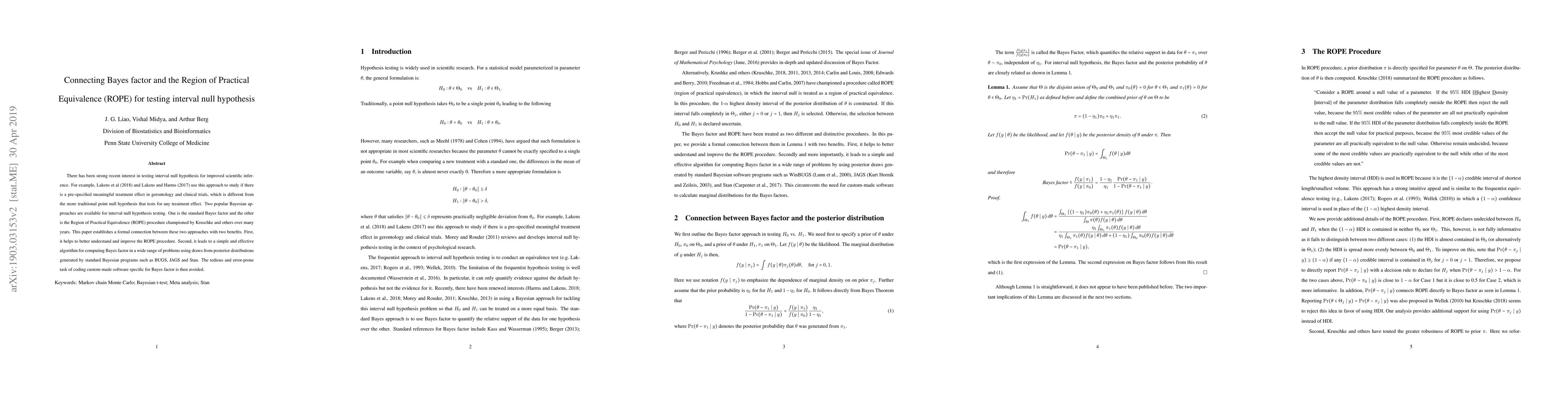 This paper connects the Bayes factor and the Region of Practical Equivalence (ROPE) for testing interval null hypotheses, enhancing scientific inference. It provides a straightforward algorithm for computing Bayes factor using standard Bayesian software, simplifying the process and improving the ROPE procedure.