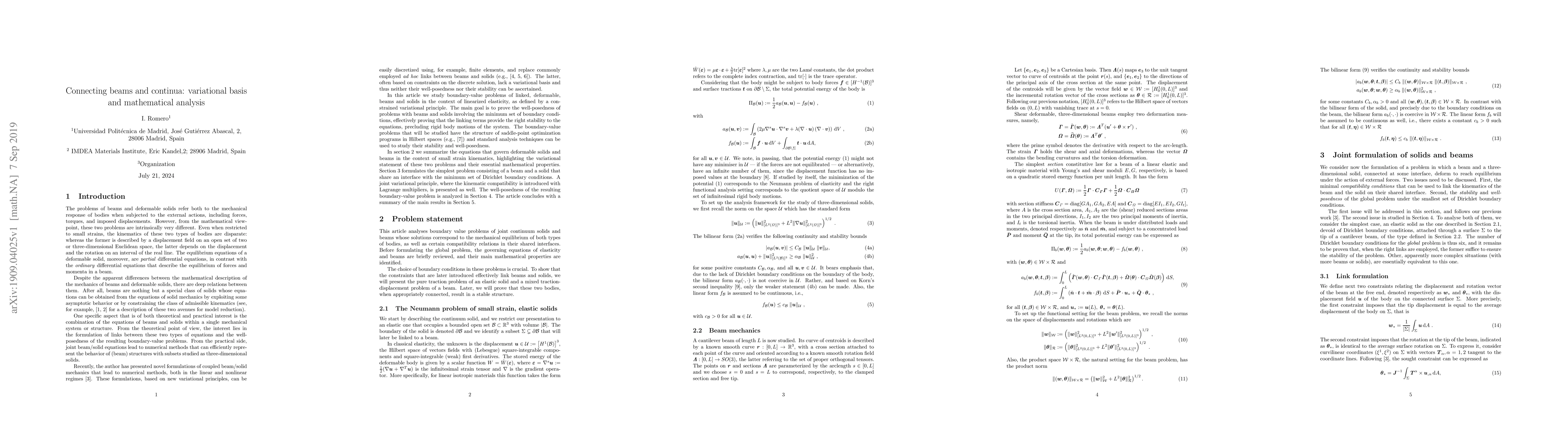 We present a new variational principle for linking models of beams and deformable solids, providing also its mathematical analysis. Despite the apparent differences between the two types of governing equations, it will be shown that the equilibrium of systems combining beams and solids can be obtained from a joint constrained variational principle and that the resulting boundary-value problem is well posed.