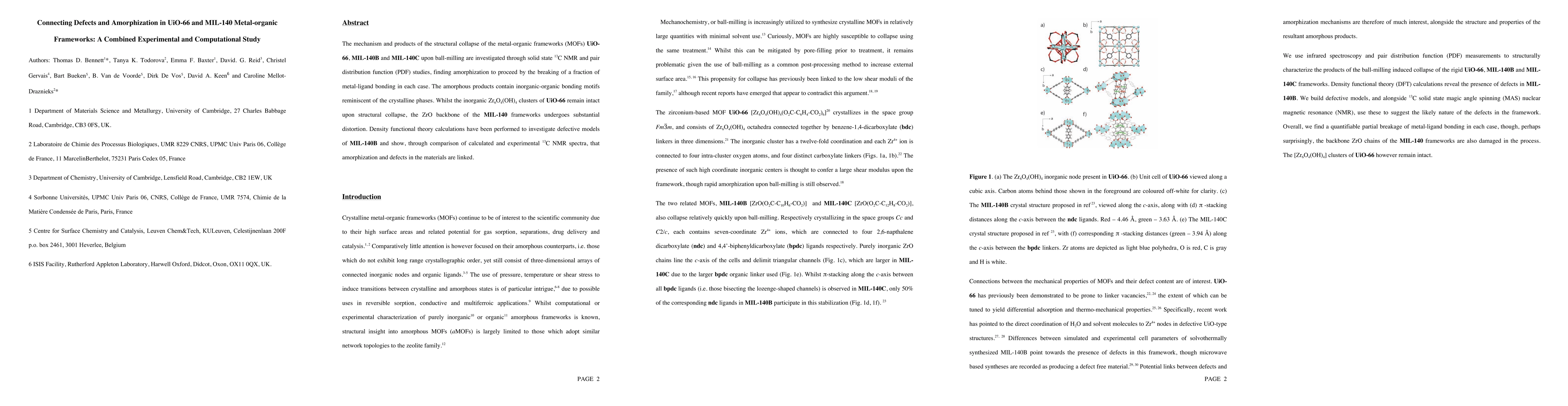This study investigates the structural collapse of UiO-66 and MIL-140 MOFs via ball-milling, revealing amorphization through broken metal-ligand bonds and intact inorganic clusters. Computational and experimental analyses show a correlation between defects and amorphization in these frameworks.