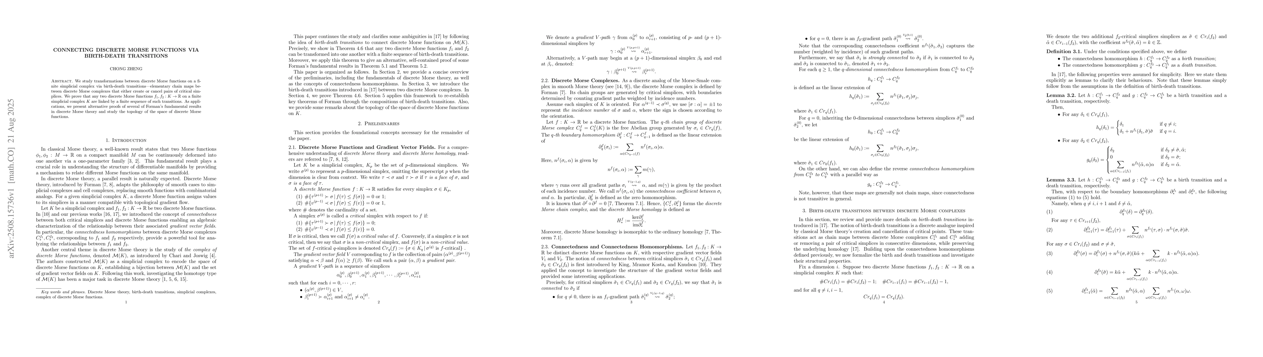 We study transformations between discrete Morse functions on a finite simplicial complex via birth-death transitions--elementary chain maps between discrete Morse complexes that either create or cancel pairs of critical simplices.We prove that any two discrete Morse functions f1, f2 on a finite simplicial complex K are linked by a finite sequence of such transitions.As applications, we present alternative proofs of several of Forman's fundamental results in discrete Morse theory and study the topology of the space of discrete Morse functions.