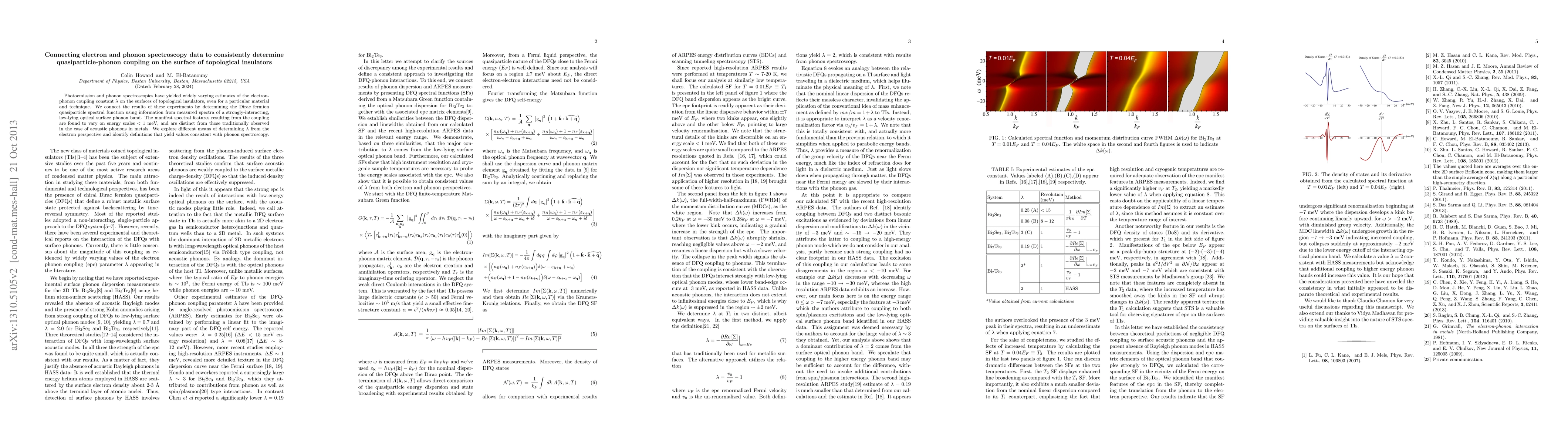 This paper aims to reconcile discrepancies in electron-phonon coupling constant (\lambda) estimates from photoemission and phonon spectroscopy on topological insulators. By analyzing the Dirac fermion quasiparticle spectral function and correlating it with optical surface phonon data, the study identifies quasiparticle-phonon coupling features that differ from those in metals.