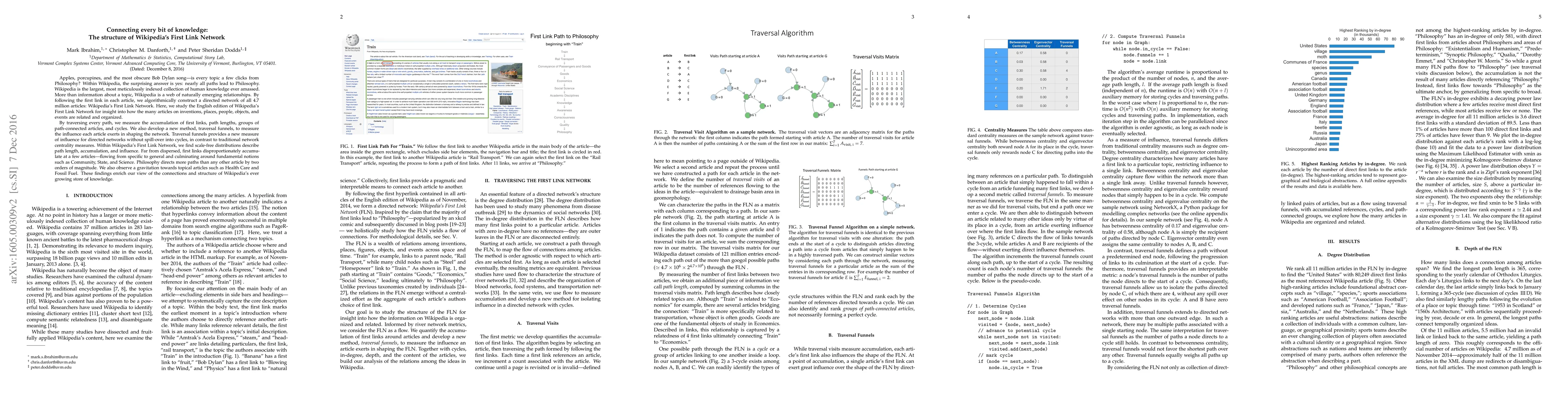 Apples, porcupines, and the most obscure Bob Dylan song---is every topic a few clicks from Philosophy? Within Wikipedia, the surprising answer is yes: nearly all paths lead to Philosophy. Wikipedia is the largest, most meticulously indexed collection of human knowledge ever amassed. More than information about a topic, Wikipedia is a web of naturally emerging relationships. By following the first link in each article, we algorithmically construct a directed network of all 4.7 million articles: Wikipedia's First Link Network. Here, we study the English edition of Wikipedia's First Link Network for insight into how the many articles on inventions, places, people, objects, and events are related and organized. By traversing every path, we measure the accumulation of first links, path lengths, groups of path-connected articles, and cycles. We also develop a new method, traversal funnels, to measure the influence each article exerts in shaping the network. Traversal funnels provides a new measure of influence for directed networks without spill-over into cycles, in contrast to traditional network centrality measures. Within Wikipedia's First Link Network, we find scale-free distributions describe path length, accumulation, and influence. Far from dispersed, first links disproportionately accumulate at a few articles---flowing from specific to general and culminating around fundamental notions such as Community, State, and Science. Philosophy directs more paths than any other article by two orders of magnitude. We also observe a gravitation towards topical articles such as Health Care and Fossil Fuel. These findings enrich our view of the connections and structure of Wikipedia's ever growing store of knowledge.