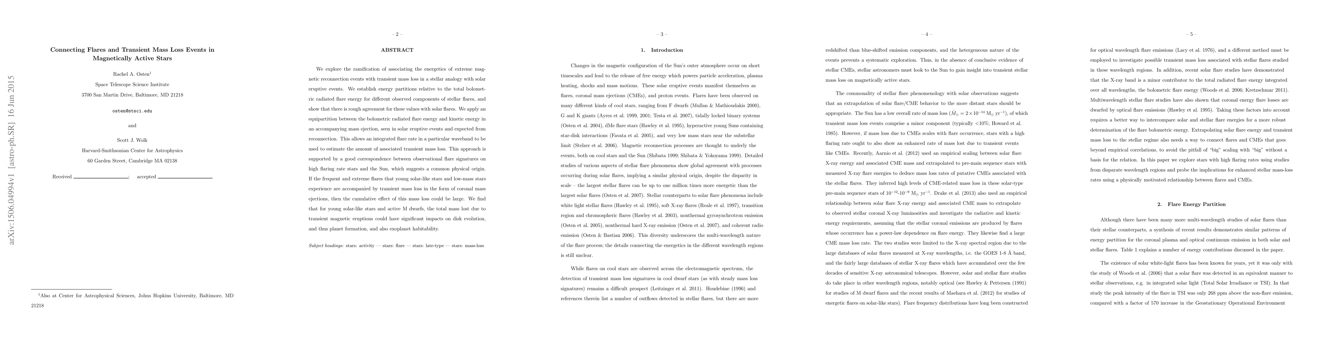 We explore the ramification of associating the energetics of extreme mag- netic reconnection events with transient mass loss in a stellar analogy with solar eruptive events. We establish energy partitions relative to the total bolometric radiated flare energy for different observed components of stellar flares, and show that there is rough agreement for these values with solar flares. We apply an equipartition between the bolometric radiated flare energy and kinetic energy in an accompanying mass ejection, seen in solar eruptive events and expected from reconnection. This allows an integrated flare rate in a particular waveband to be used to estimate the amount of associated transient mass loss. This approach is supported by a good correspondence between observational flare signatures on high flaring rate stars and the Sun, which suggests a common physical origin. If the frequent and extreme flares that young solar-like stars and low-mass stars experience are accompanied by transient mass loss in the form of coronal mass ejections, then the cumulative effect of this mass loss could be large. We find that for young solar-like stars and active M dwarfs, the total mass lost due to transient magnetic eruptions could have significant impacts on disk evolution, and thus planet formation, and also exoplanet habitability.